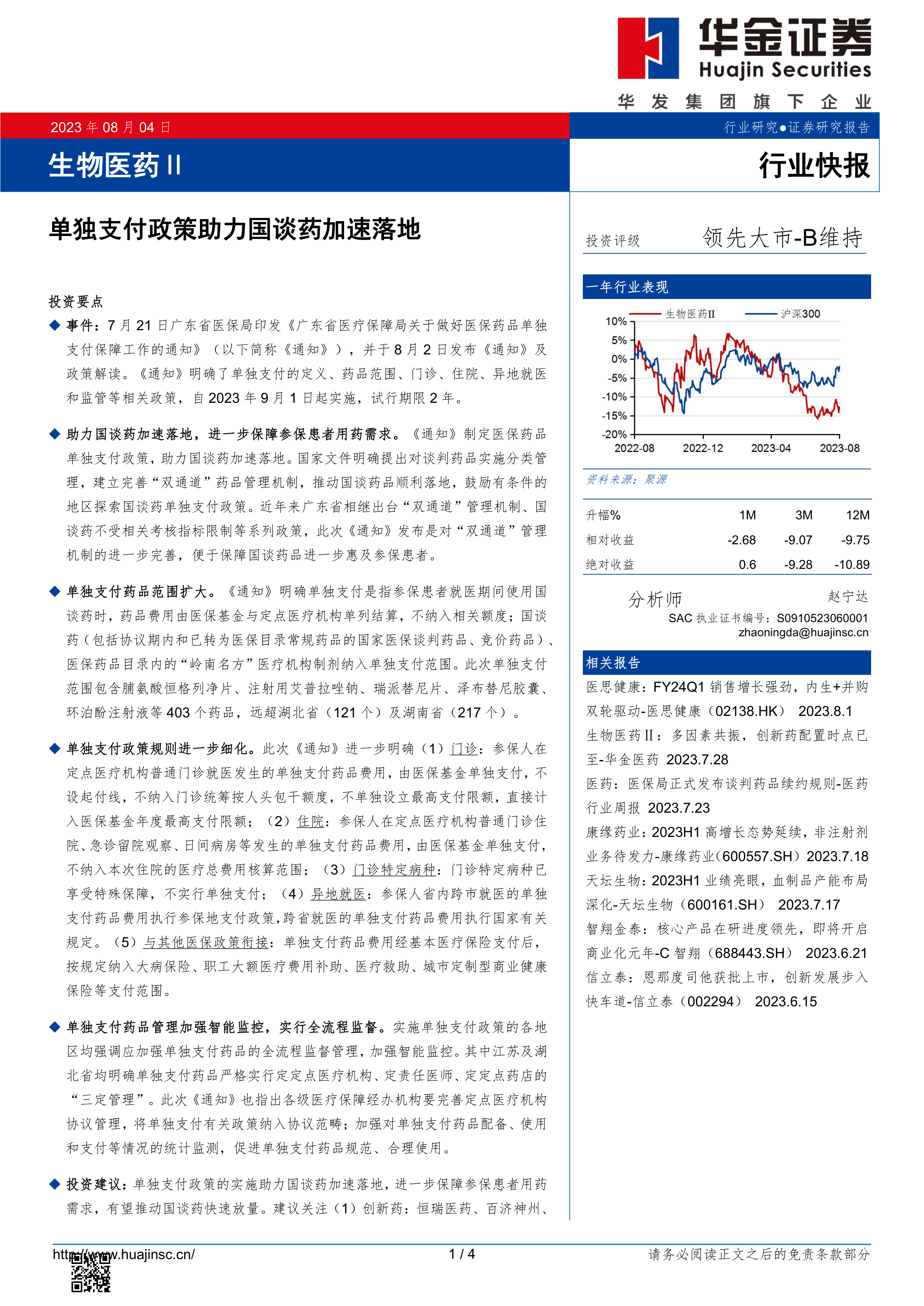 事件: 7 月 21 日广东省医保局印发《 广东省医疗保障局关于做好医保药品单独支付保障工作的通知》 ( 以下简称《 通知》 ) , 并于 8 月 2 日发布《 通知》 及政策解读。 《 通知》 明确了单独支付的定义、 药品范围、 门诊、 住院、 异地就医和监管等相关政策, 自 2023 年 9 月 1 日起实施, 试行期限 2 年。