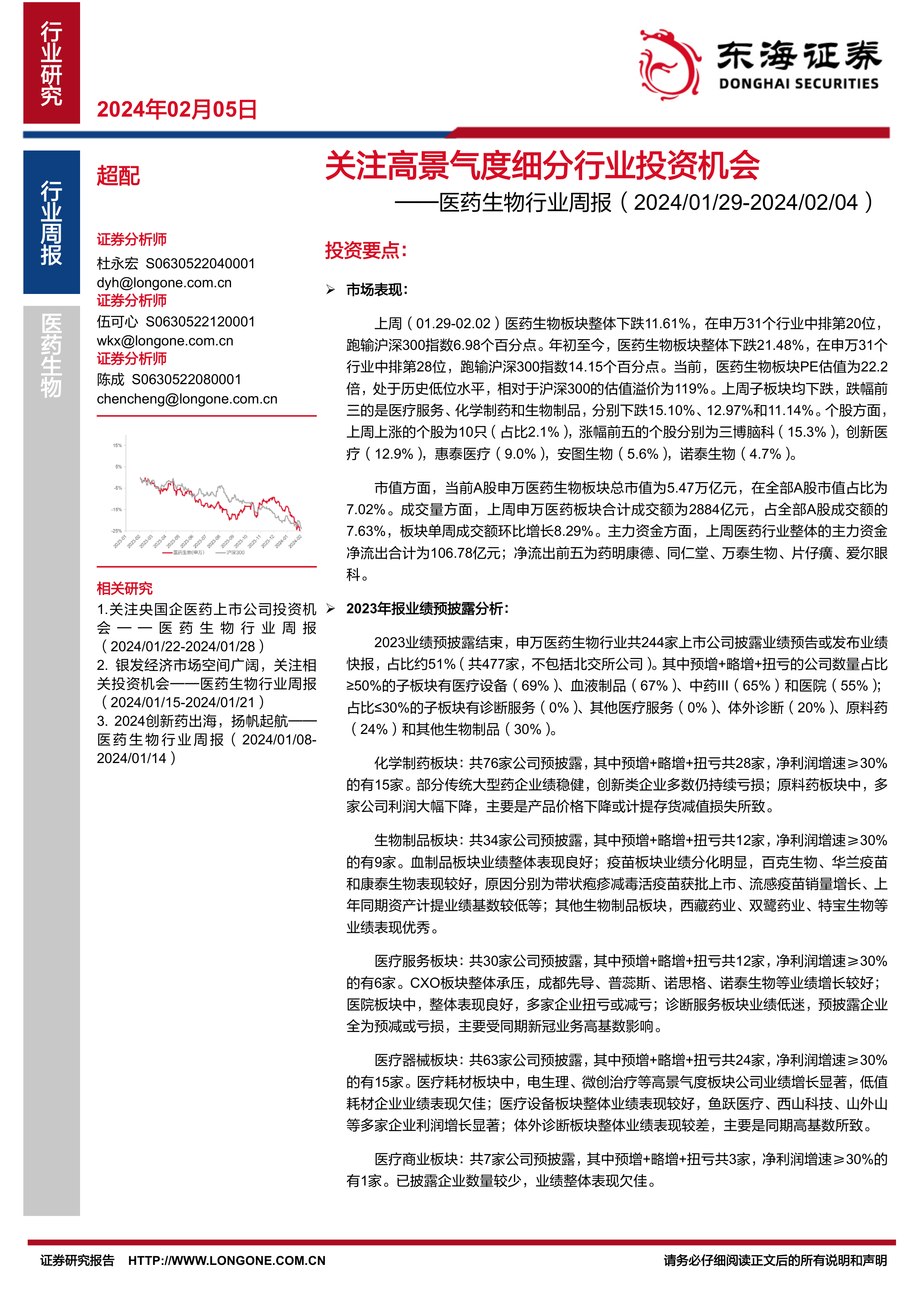 上周(01.29-02.02)医药生物板块整体下跌11.61%,在申万31个行业中排第20位,跑输沪深300指数6.98个百分点。年初至今,医药生物板块整体下跌21.48%,在申万31个行业中排第28位,跑输沪深300指数14.15个百分点。当前,医药生物板块PE估值为22.2倍,处于历史低位水平,相对于沪深300的估值溢价为119%。上周子板块均下跌,跌幅前三的是医疗服务、化学制药和生物制品,分别下跌15.10%、12.97%和11.14%。个股方面,上周上涨的个股为10只(占比2.1%),涨幅前五的个股分别为三博脑科(15.3%),创新医疗(12.9%),惠泰医疗(9.0%),安图生物(5.6%),诺泰生物(4.7%)。