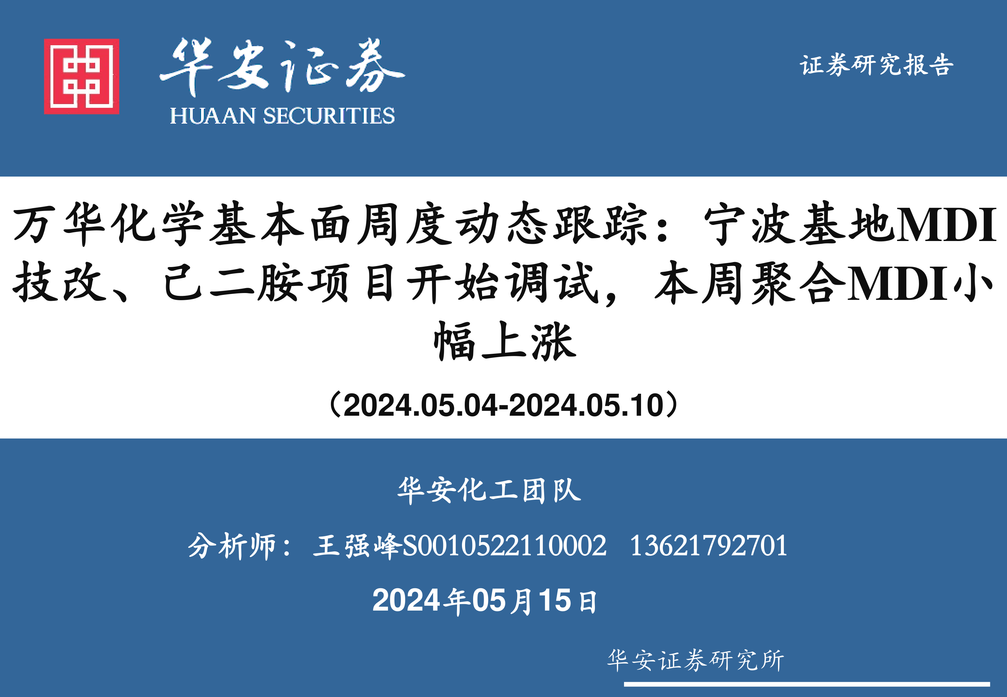 万华化学基本面周度动态跟踪:宁波基地MDI技改、己二胺项目开始调试,本周聚合MDI小幅上涨