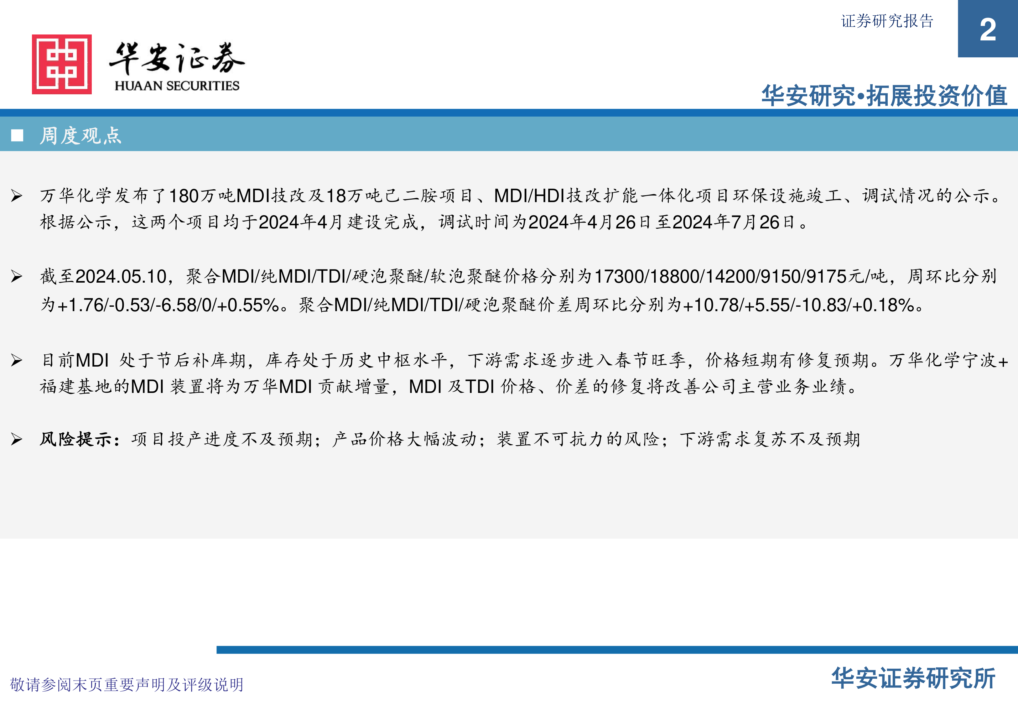 本报告的核心观点是:万华化学宁波基地MDI技改及己二胺项目调试进展顺利,叠加MDI处于节后补库期,下游需求旺盛,短期内MDI价格有修复预期,这将利好万华化学主营业务业绩。然而,报告也指出了潜在风险,例如项目投产进度不及预期、产品价格大幅波动、装置不可抗力以及下游需求复苏不及预期等。