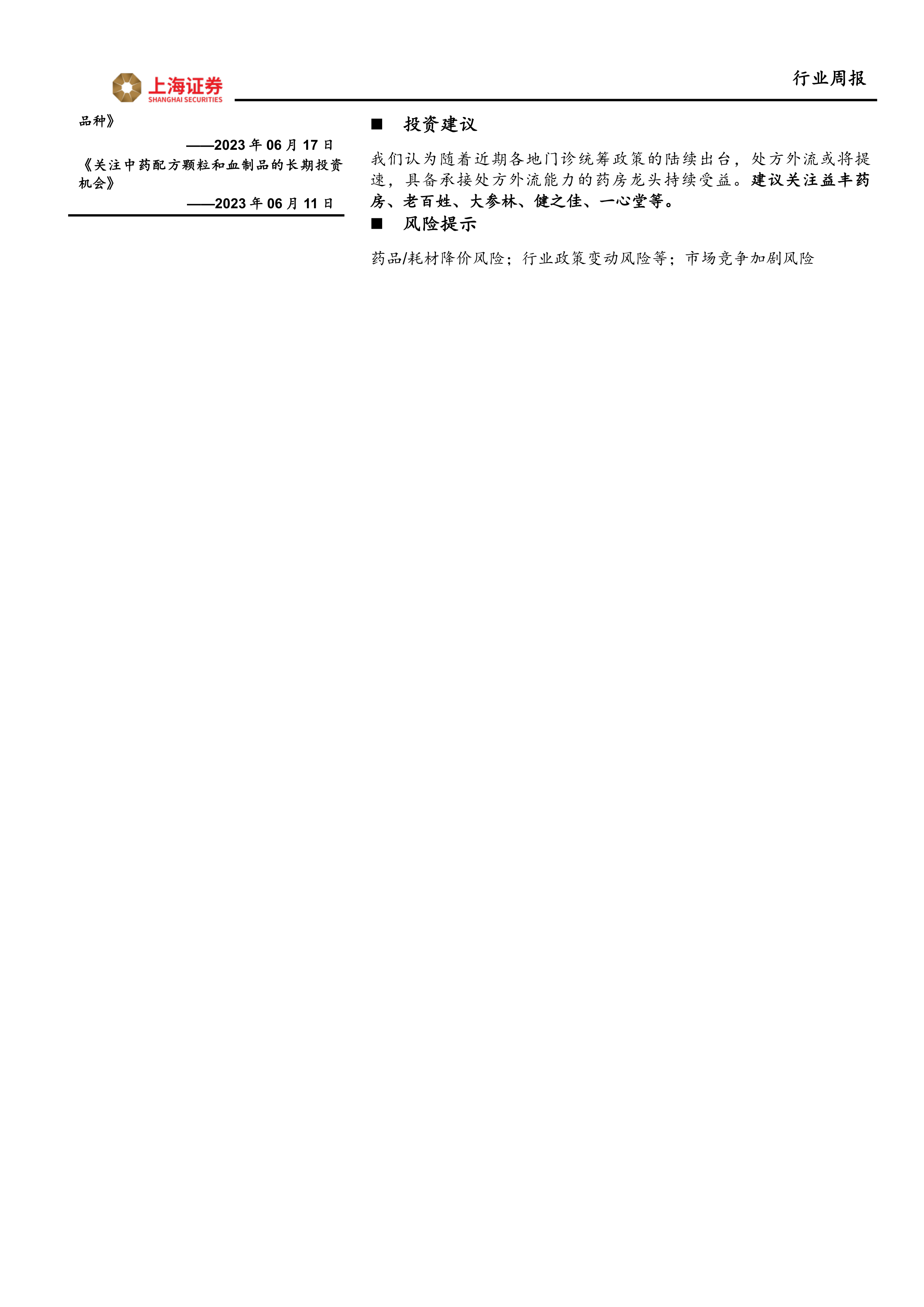 我们认为随着近期各地门诊统筹政策的陆续出台,处方外流或将提速,具备承接处方外流能力的药房龙头持续受益。建议关注益丰药房、老百姓、大参林、健之佳、一心堂等。