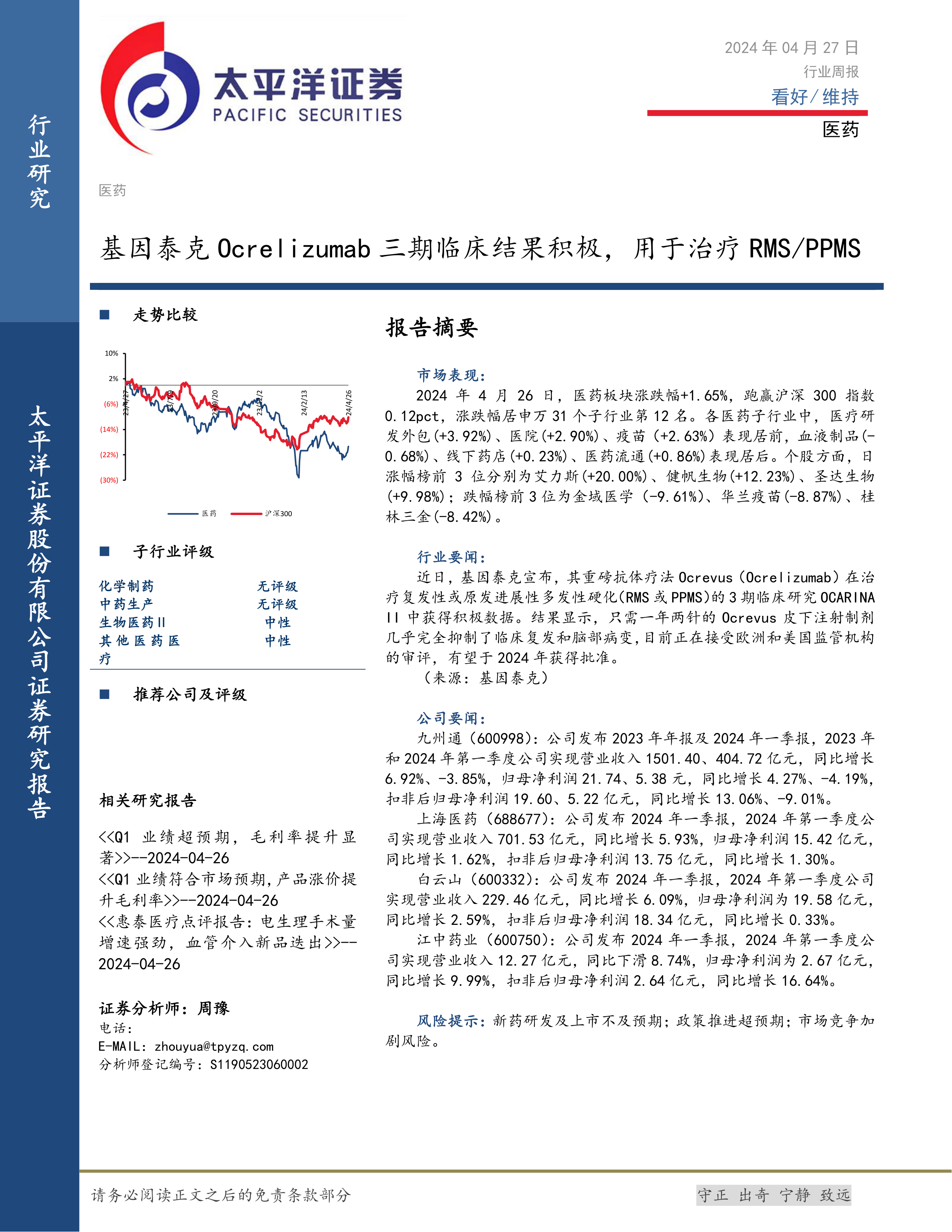 本报告对医药行业近期表现进行了总结,重点关注了基因泰克Ocrelizumab药物的积极临床结果以及部分上市公司的季度业绩。报告指出,医药行业整体表现稳健,但不同子行业和个股表现差异较大。投资者需关注行业发展趋势、公司基本面和市场风险,谨慎进行投资决策。 报告中缺乏具体的投资建议和详细的风险提示,这限制了报告的实用性,建议补充完善。
