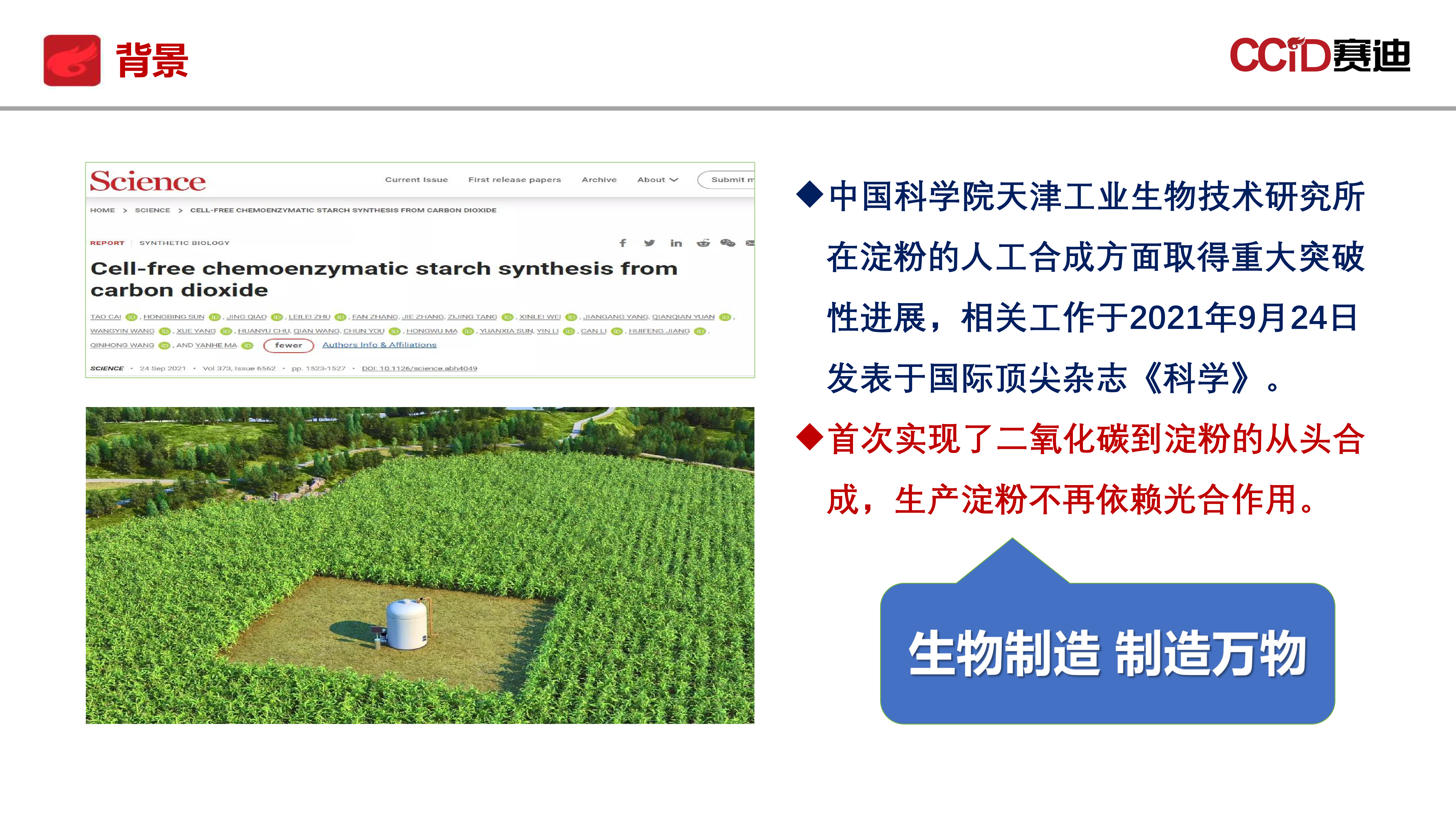 首次实现了二氧化碳到淀粉的从头合成,生产淀粉不再依赖光合作用。生物制二造是科技创新与产业革命的关键领域
