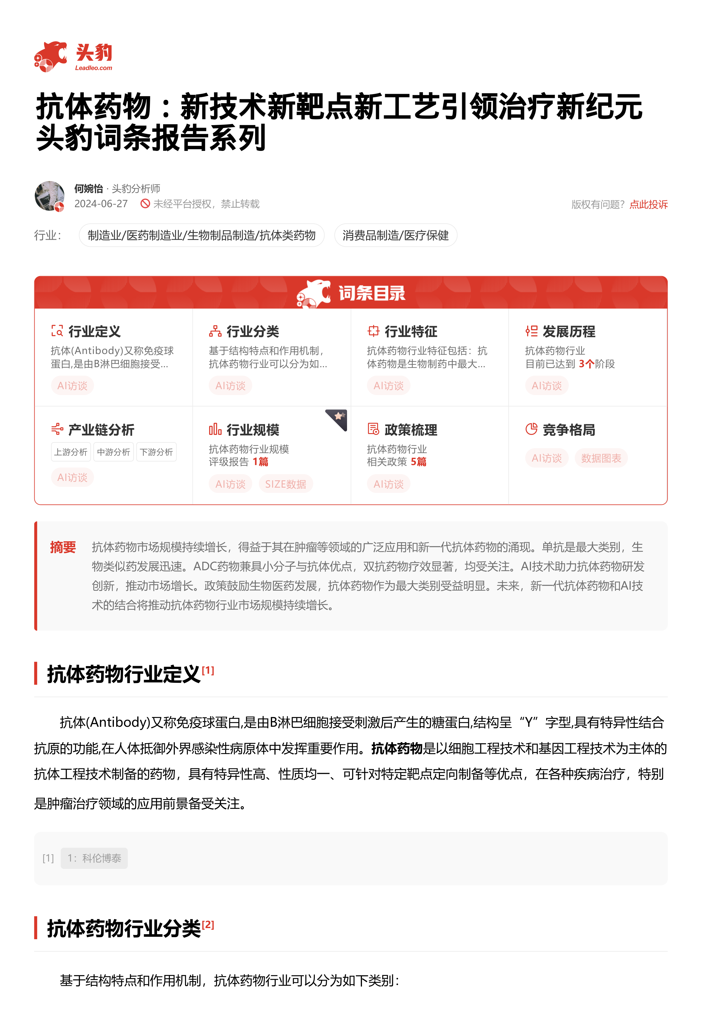 抗体药物:新技术新靶点新工艺引领治疗新纪元 头豹词条报告系列