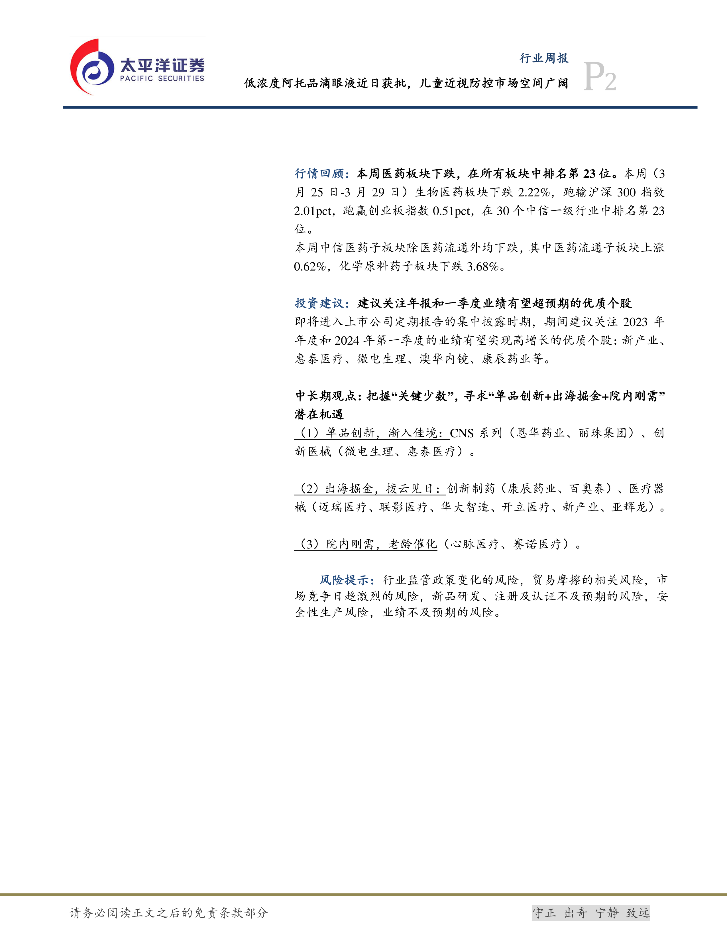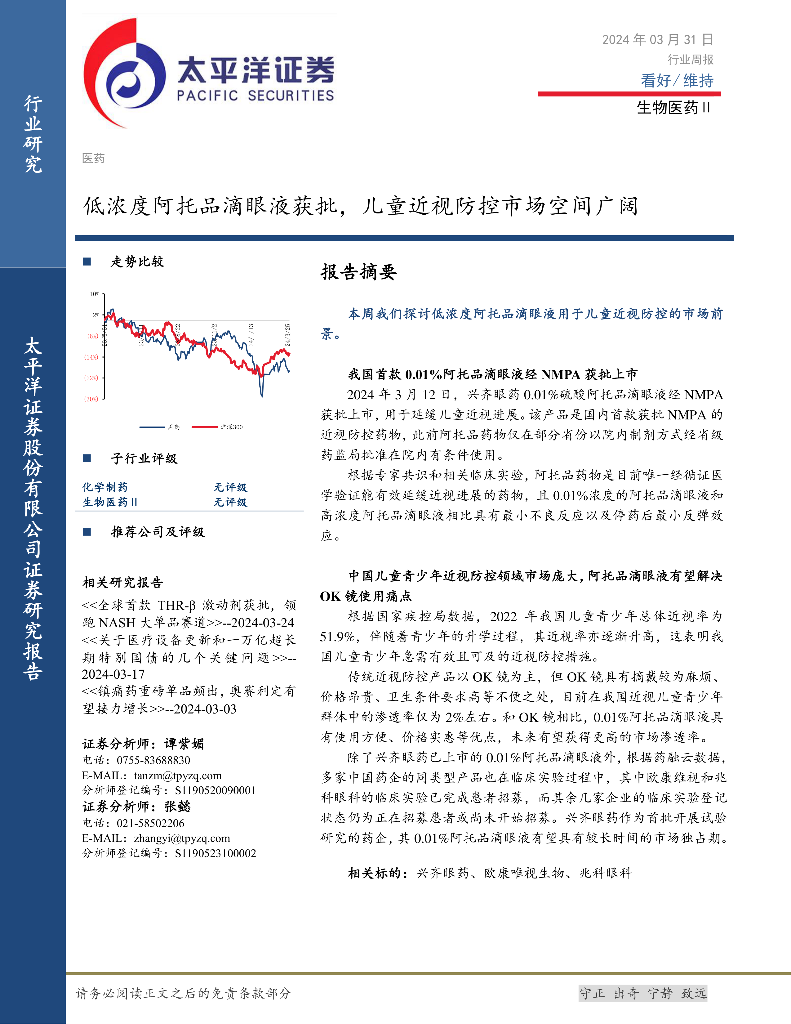 本报告的核心观点是:低浓度阿托品滴眼液的获批上市为中国儿童青少年近视防控市场带来了新的机遇。该产品克服了传统OK镜使用不便、价格昂贵等缺点,具有广阔的市场前景,但同时也面临着市场竞争加剧和产品研发风险等挑战。 报告同时分析了医药板块整体行情,并对部分优质个股进行了投资建议。