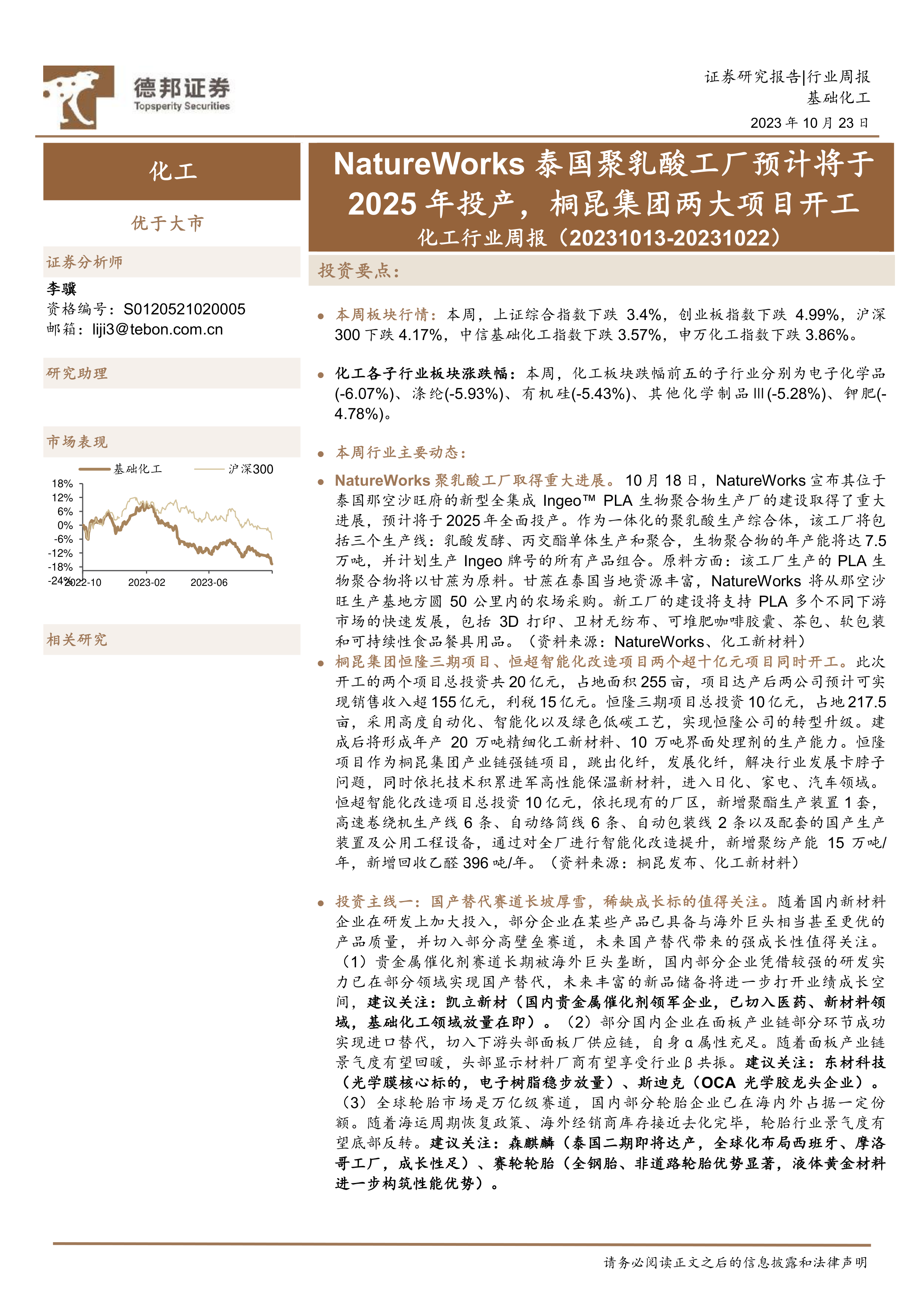 化工行业周报:NatureWorks泰国聚乳酸工厂预计将于2025年投产,桐昆集团两大项目开工