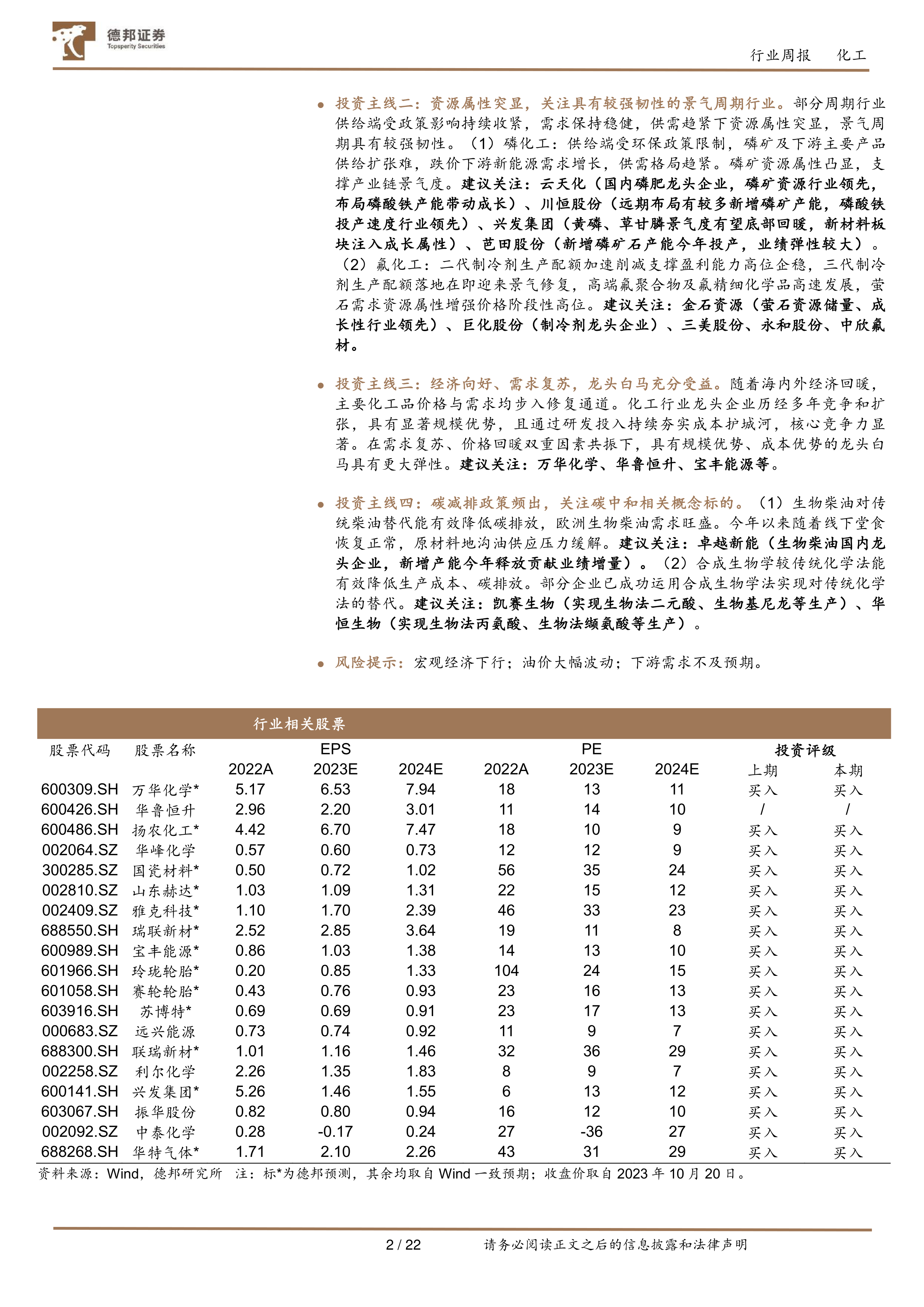 投资主线二:资源属性突显,关注具有较强韧性的景气周期行业。部分周期行业供给端受政策影响持续收紧,需求保持稳健,供需趋紧下资源属性突显,景气周期具有较强韧性。(1)磷化工:供给端受环保政策限制,磷矿及下游主要产品供给扩张难,跌价下游新能源需求增长,供需格局趋紧。磷矿资源属性凸显,支撑产业链景气度。建议关注:云天化(国内磷肥龙头企业,磷矿资源行业领先,布局磷酸铁产能带动成长)、川恒股份(远期布局有较多新增磷矿产能,磷酸铁投产速度行业领先)、兴发集团(黄磷、草甘膦景气度有望底部回暖,新材料板块注入成长属性)、芭田股份(新增磷矿石产能今年投产,业绩弹性较大)。(2)氟化工:二代制冷剂生产配额加速削减支撑盈利能力高位企稳,三代制冷剂生产配额落地在即迎来景气修复,高端氟聚合物及氟精细化学品高速发展,萤石需求资源属性增强价格阶段性高位。建议关注:金石资源(萤石资源储量、成长性行业领先)、巨化股份(制冷剂龙头企业)、三美股份、永和股份、中欣氟材。