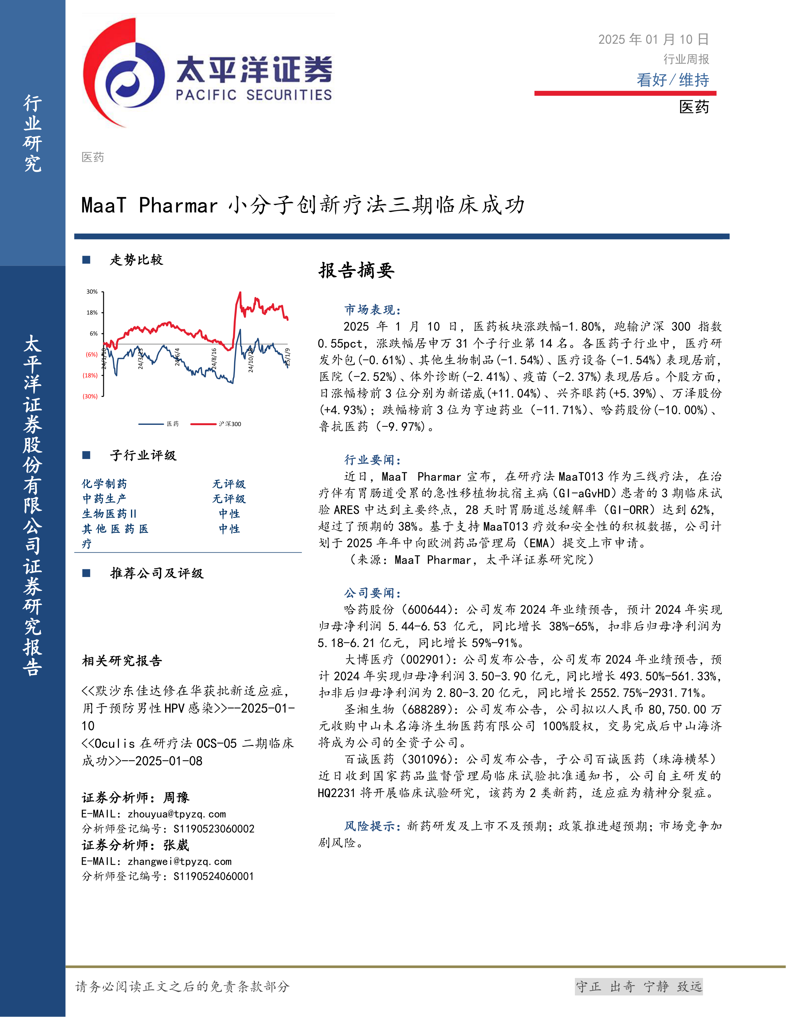 本报告的核心观点是:医药板块整体表现略逊于大盘,但个别公司表现亮眼。MaaT Pharmar小分子创新疗法三期临床试验成功是本周医药行业最重要的事件,为行业发展注入强心剂,并可能推动相关公司股价上涨。同时,部分公司发布的业绩预告显示出良好的增长态势。
