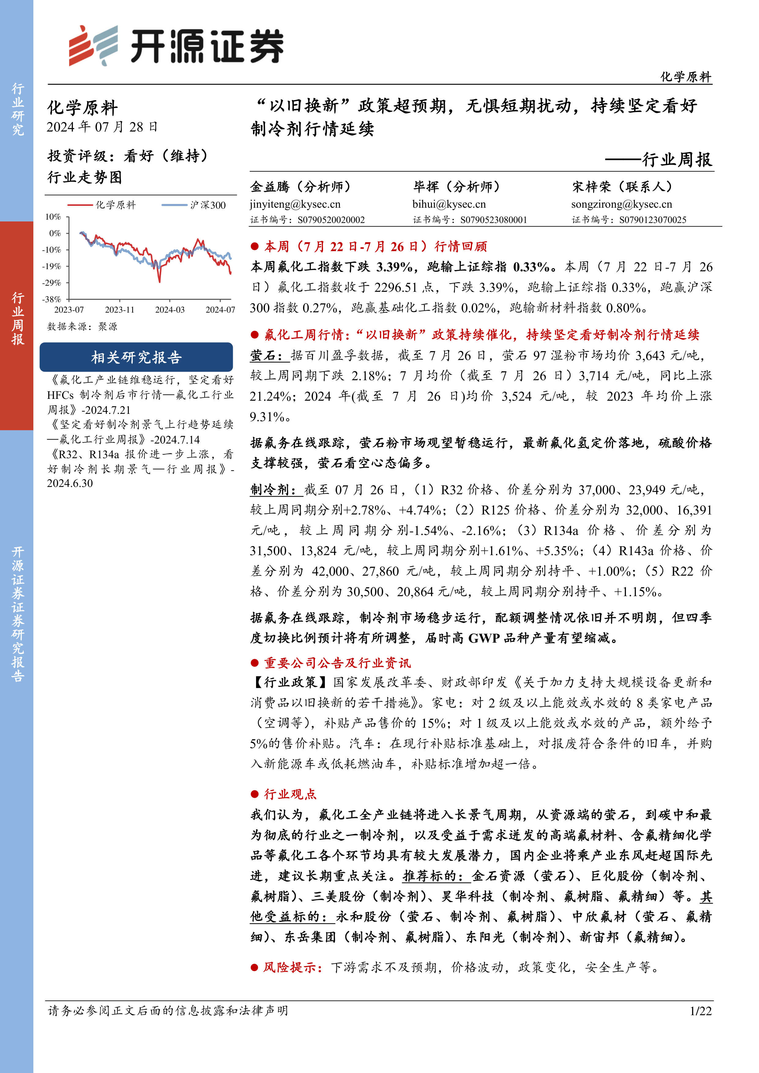 化学原料行业周报:“以旧换新”政策超预期,无惧短期扰动,持续坚定看好制冷剂行情延续