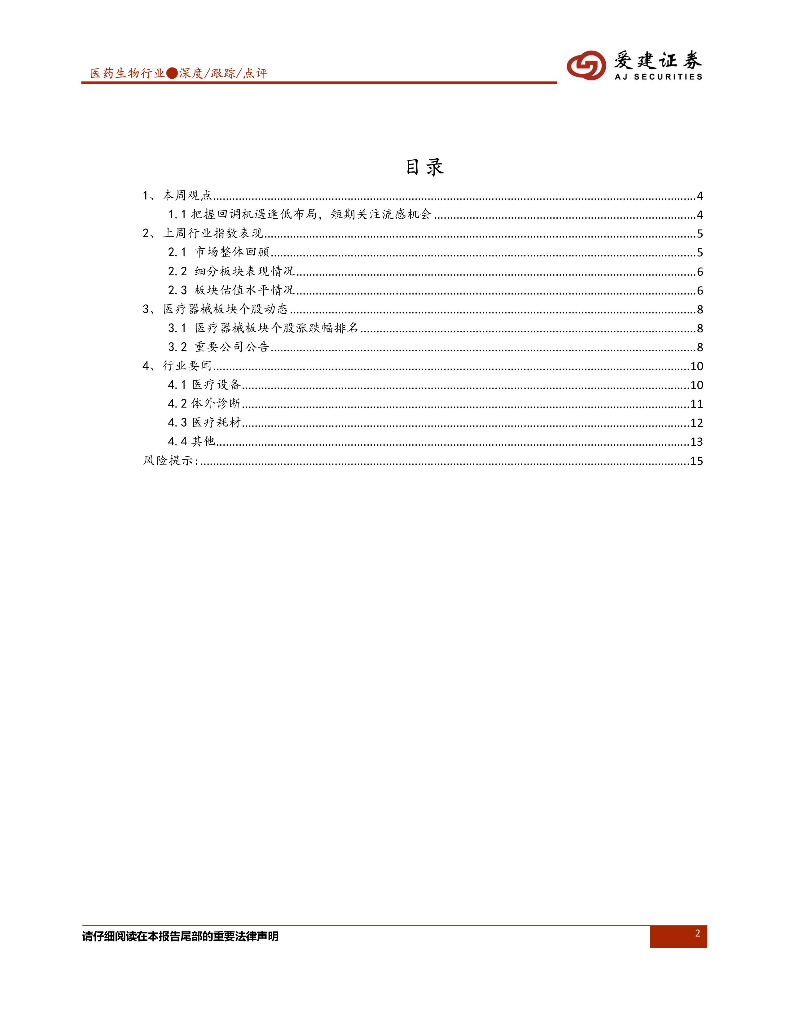 本报告对医药生物行业,特别是医疗器械板块的近期市场表现、估值水平、个股动态和行业政策进行了全面分析。报告指出,虽然本周医药板块出现回调,但长期来看,创新、疫后需求复苏和政策支持下的医疗新基建仍是重要的投资主线。短期内,流感疫情也带来一定的投资机会。投资者应关注低估值个股,并密切关注行业政策变化和公司发展动态。 报告中提供的各项数据和信息,为投资者进行投资决策提供了参考依据。 然而,投资者需注意报告中提到的风险因素,并进行独立的判断和分析。