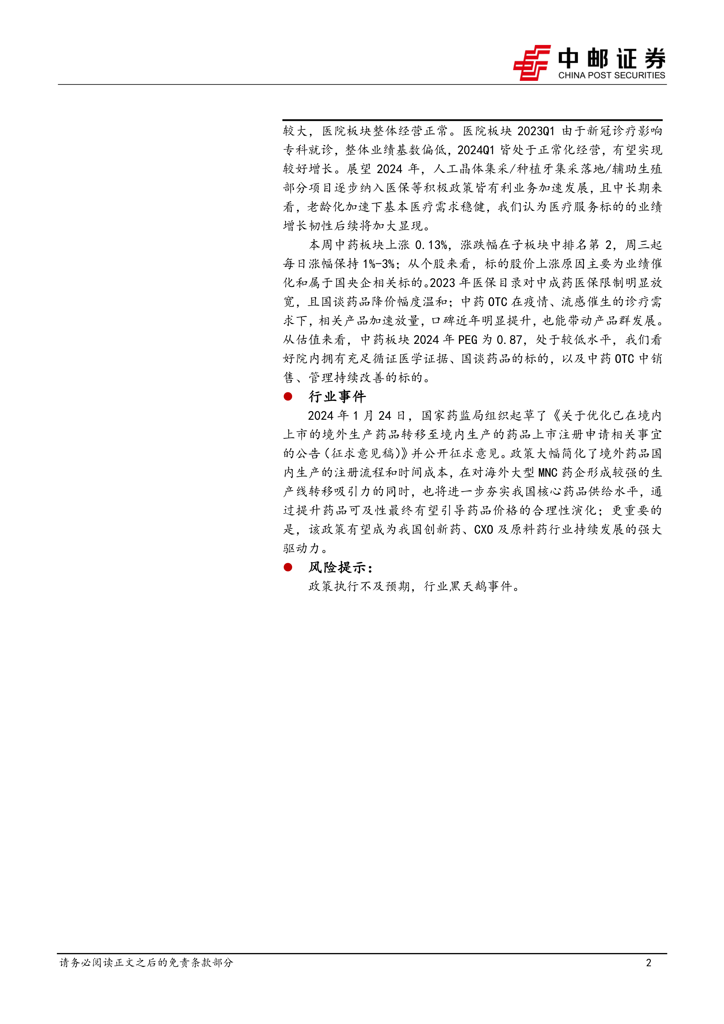 本周中药板块上涨0.13%,涨跌幅在子板块中排名第2,周三起每日涨幅保持1%-3%;从个股来看,标的股价上涨原因主要为业绩催化和属于国央企相关标的。2023年医保目录对中成药医保限制明显放宽,且国谈药品降价幅度温和;中药OTC在疫情、流感催生的诊疗需求下,相关产品加速放量,口碑近年明显提升,也能带动产品群发展从估值来看,中药板块2024年PEG为0.87,处于较低水平,我们看好院内拥有充足循证医学证据、国谈药品的标的,以及中药OTC中销售、管理持续改善的标的。