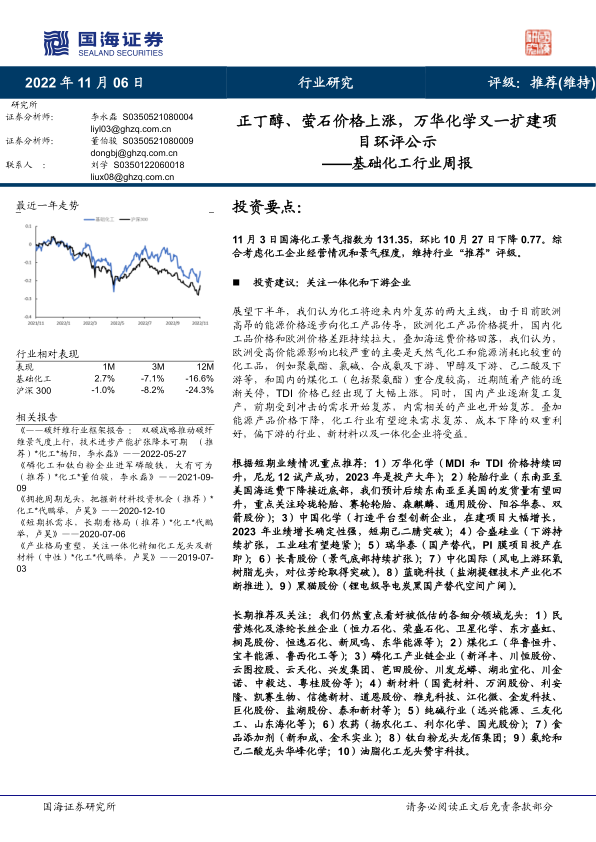 本报告通过对国海化工景气指数、原油价格、重点化工产品价格(正丁醇、萤石、硫酸等)以及重点公司(万华化学、玲珑轮胎、赛轮轮胎、森麒麟、恒力石化、荣盛石化、东方盛虹、恒逸石化、卫星化学、桐昆股份、新凤鸣、新洋丰、云图控股、齐翔腾达、龙佰集团、中国化学、双箭股份、阳谷华泰、华峰化学、新和成、三友化工、华鲁恒升、宝丰能源、国瓷材料、金禾实业、瑞华泰、扬农化工、利尔化学、广信股份、赞宇科技、长青股份、国光股份、远兴能源、道恩股份、金发科技、蓝晓科技、盐湖股份、雅克科技、万润股份、利安隆、粤桂股份、中化国际、楚江新材、江化微、华恒生物、山东赫达、山东海化等)的跟踪分析,对2022年下半年化工行业市场进行了深入解读。
