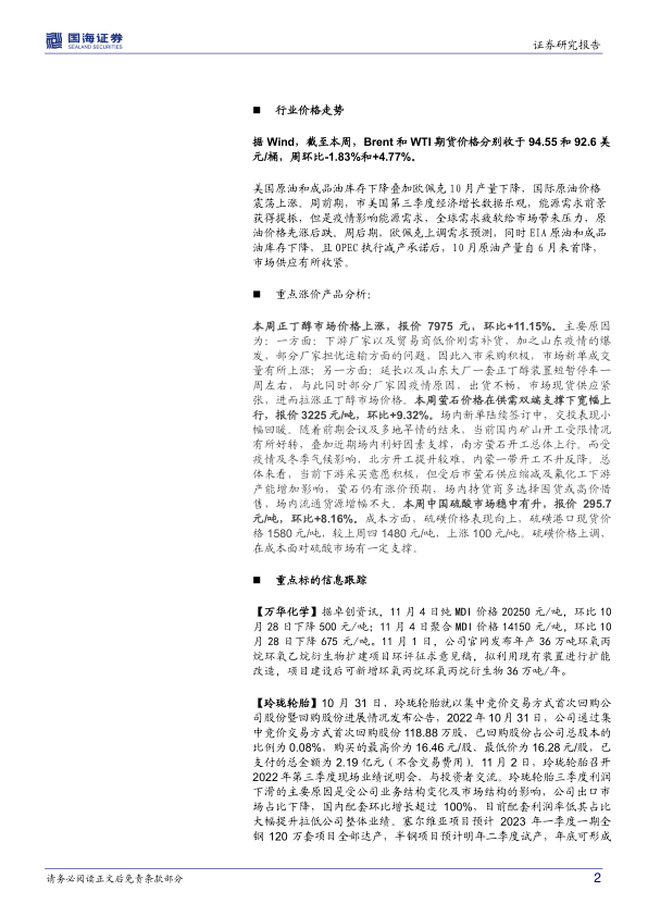 报告首先指出11月3日国海化工景气指数为131.35,环比下降0.77%,但综合考虑化工企业经营情况和景气程度,维持行业“推荐”评级。 随后,报告详细分析了国际原油价格及库存的波动情况,并对正丁醇、萤石、硫酸等重点涨价产品进行了深入分析,阐述了其价格上涨的原因,例如正丁醇价格上涨主要由于下游补货需求增加和部分装置停车等因素。