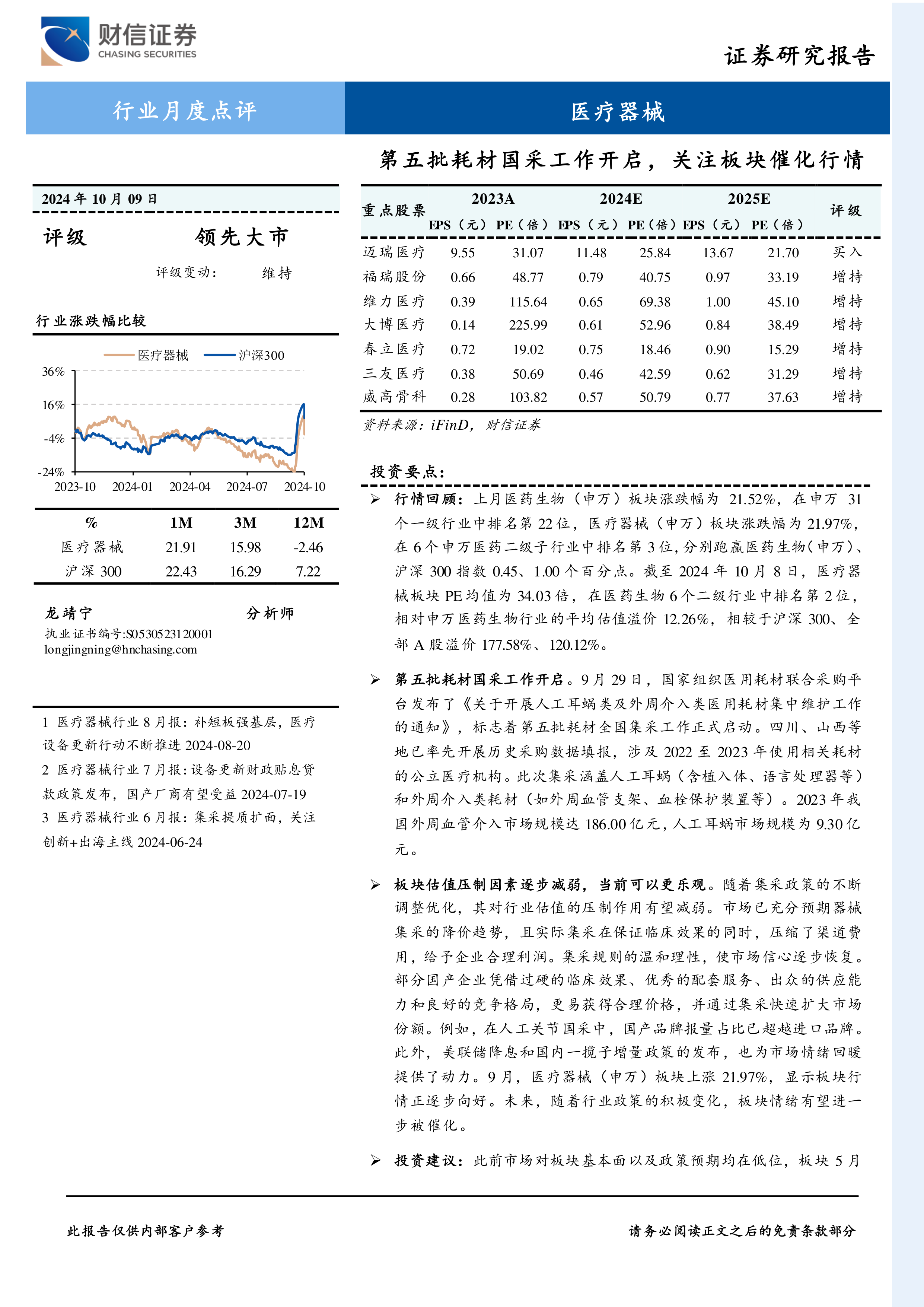 本报告分析了2024年9月至10月医疗器械板块的行情,重点关注了第五批耗材国采的启动及其对行业的影响。报告认为,第五批耗材国采以及政策环境的积极变化,将利好医疗器械板块,国产品牌有望受益。报告建议投资者关注具备自主创新能力和出海能力的研发平台化企业,以及受益于集采和国产替代的眼科及家用器械企业,以及骨科耗材和电生理领域的国内企业。 然而,投资者仍需关注行业竞争加剧、集采政策变化以及政策力度不及预期的风险。