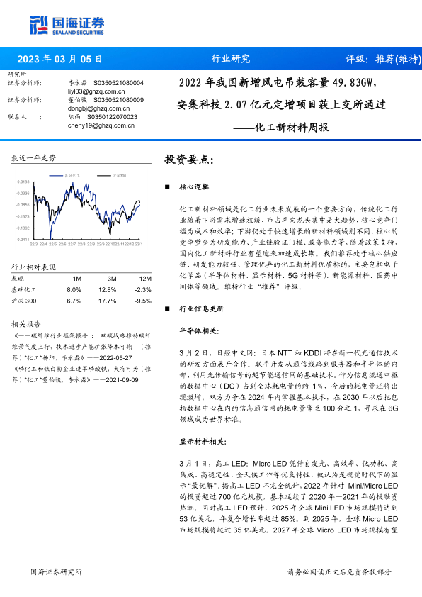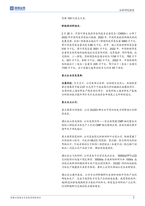 化工新材料周报:2022年我国新增风电吊装容量49.83GW,安集科技2.07亿元定增项目获上交所通过