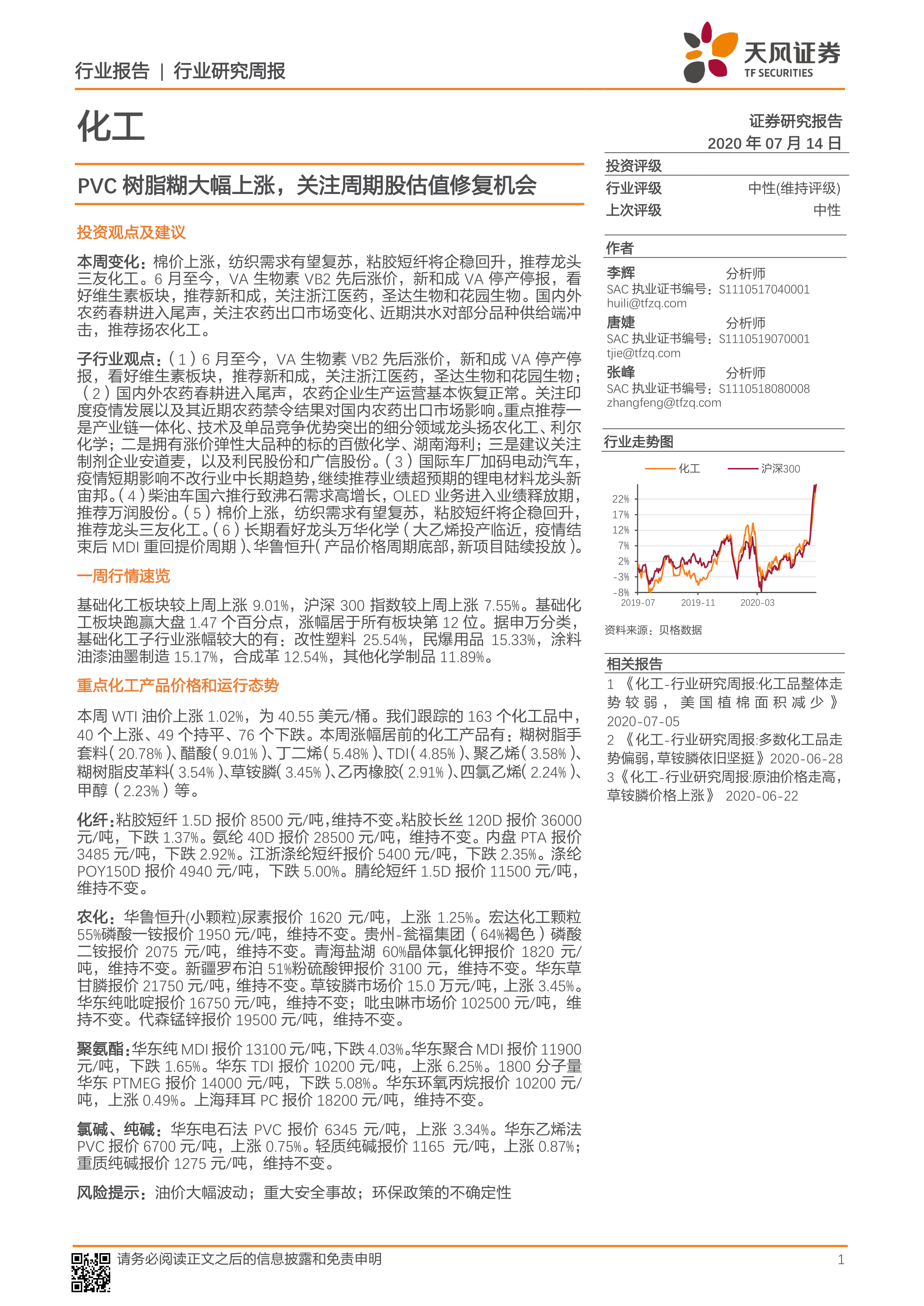 化工行业研究周报:PVC树脂糊大幅上涨,关注周期股估值修复机会