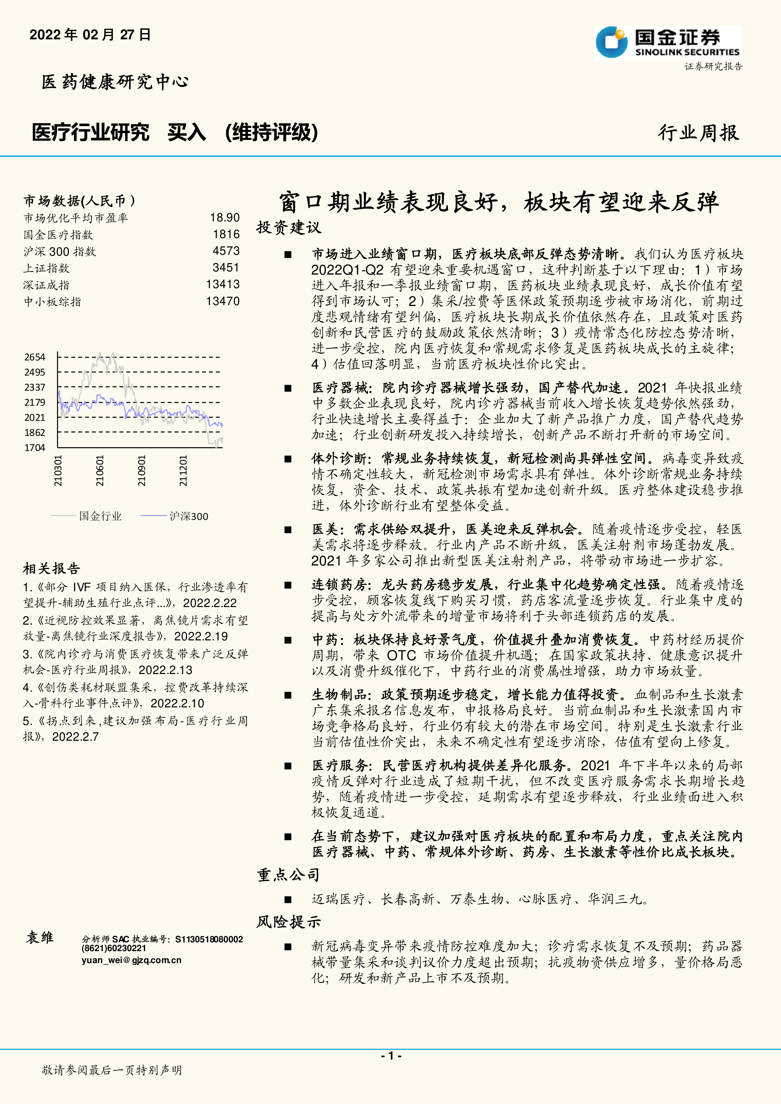 本报告基于对市场数据的分析,认为医疗板块在2022年第一、二季度将迎来重要机遇窗口。报告对医疗行业多个细分板块进行了深入分析,包括院内医疗器械、体外诊断、医美、连锁药房、中药、生物制品和辅助生殖等,并指出重点关注院内医疗器械、中药、常规体外诊断、药房、生长激素等性价比成长板块,以及迈瑞医疗、长春高新、万泰生物、心脉医疗、华润三九等重点公司。 报告也指出了潜在的风险因素,例如新冠病毒变异、诊疗需求恢复不及预期、医保政策力度超出预期等。 投资者应根据自身风险承受能力和投资目标,谨慎决策。