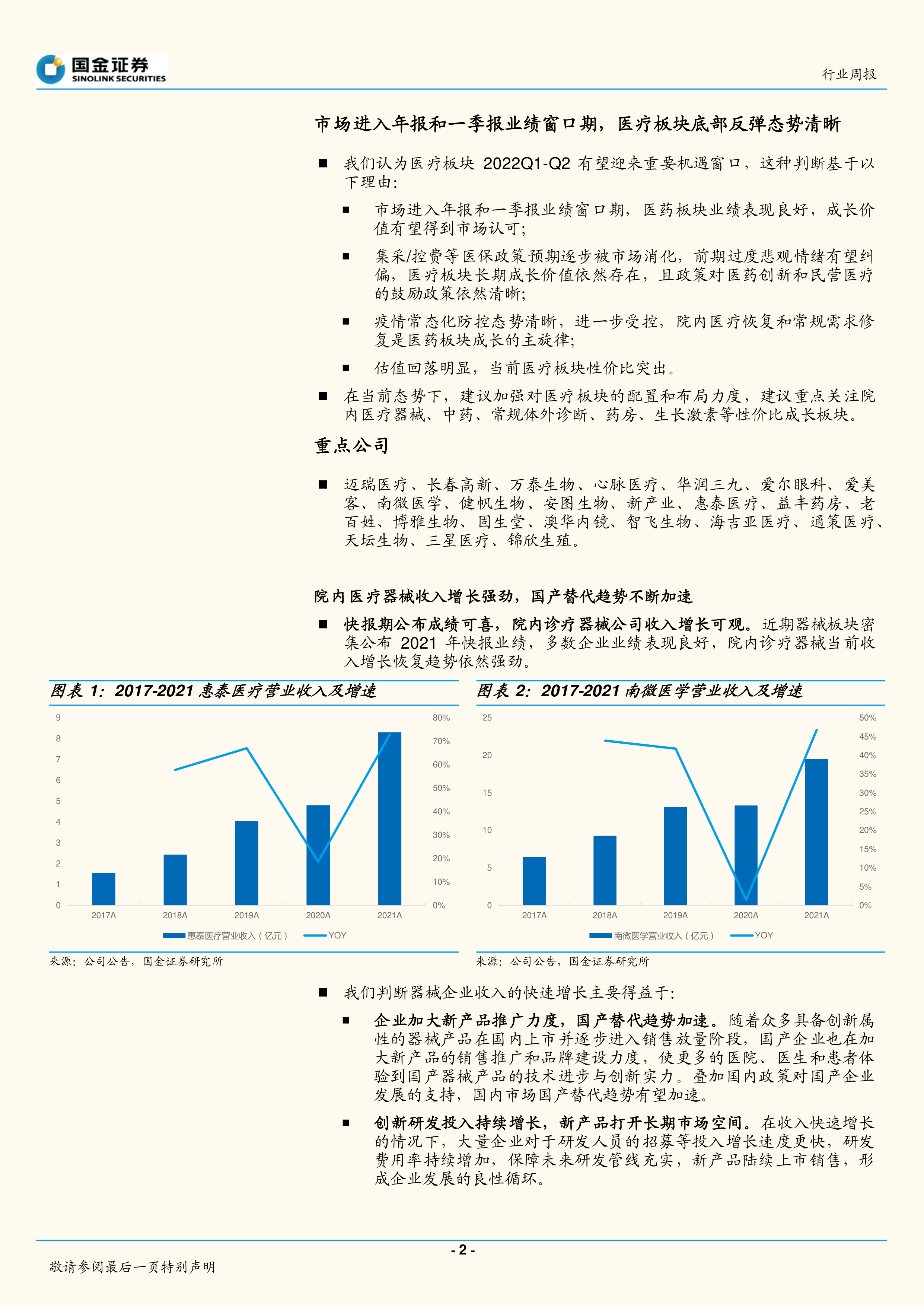 院内诊疗器械增长强劲,国产替代加速。2021年快报业绩显示多数企业表现良好,收入增长恢复趋势强劲。这主要得益于企业加大新产品推广力度,国产替代趋势加速,以及创新研发投入持续增长。报告还分析了省级联盟集采政策的优化,认为企业有望保留合理利润空间,医保政策边际缓和。图表1和图表2展示了惠泰医疗和南微医学2017-2021年的营业收入及增速。