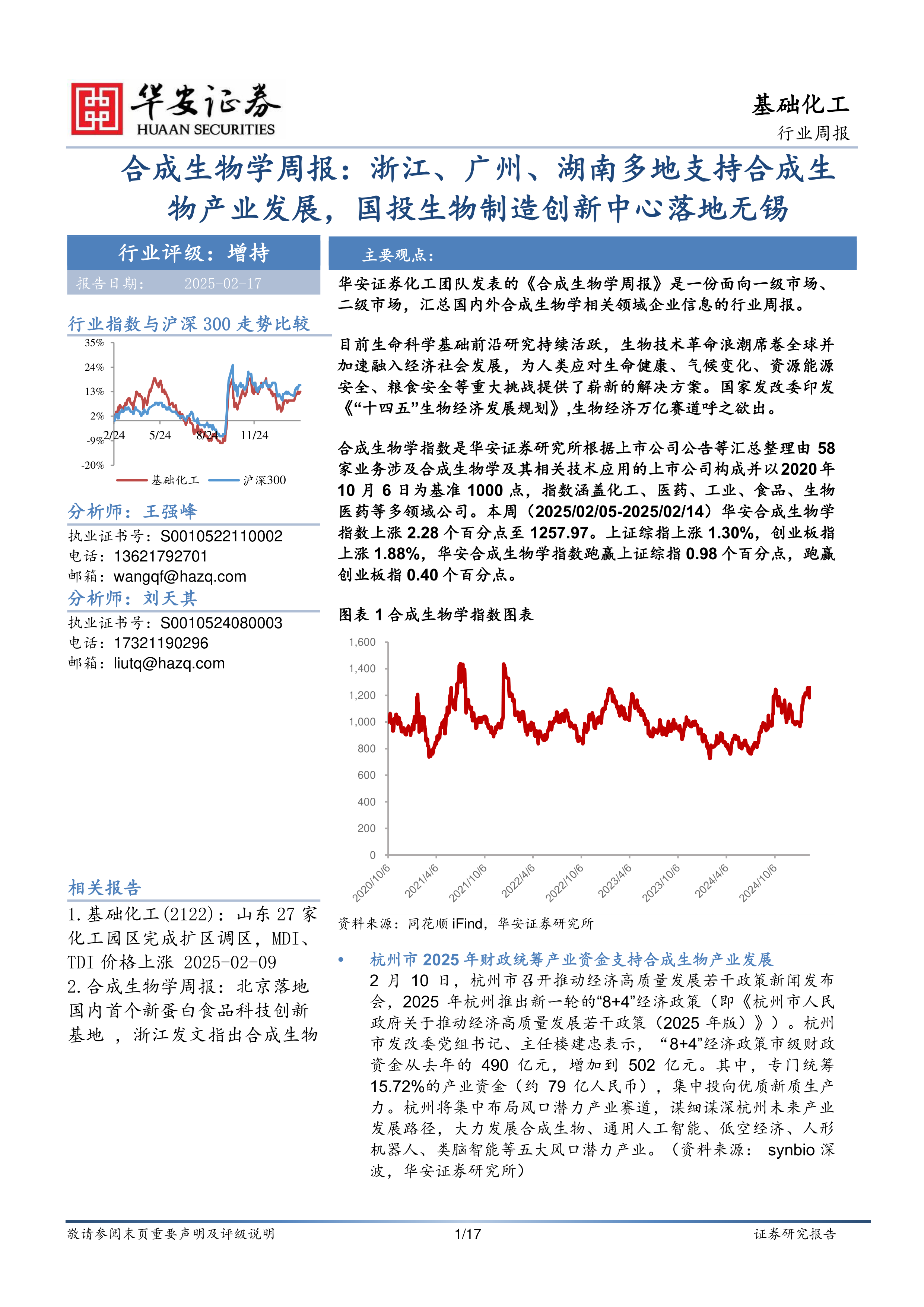 本周(2025/02/05-2025/02/14),华安合成生物学指数上涨2.28%,跑赢上证综指0.98个百分点,跑赢创业板指0.40个百分点。部分个股涨幅显著,例如亚香股份(+44%)、诺禾致源(+22%)、贝瑞基因(+21%)等,主要集中在生物医药、化工和食品领域。部分个股出现下跌,例如保龄宝(-5%)、平潭发展(-4%)等,主要集中在化工和食品领域。