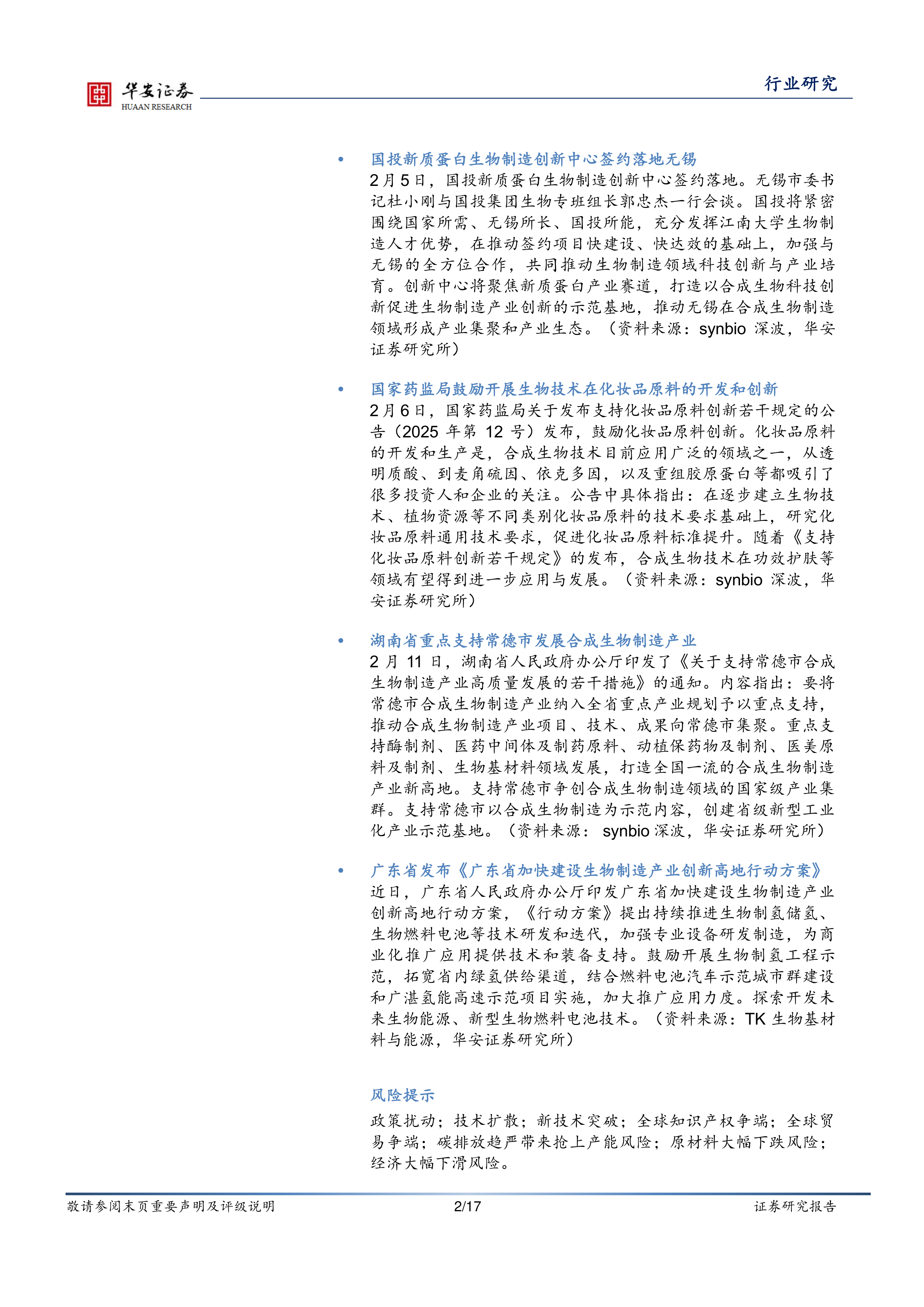 2月6日,国家药监局关于发布支持化妆品原料创新若干规定的公告(2025年第12号)发布,鼓励化妆品原料创新。化妆品原料的开发和生产是,合成生物技术目前应用广泛的领域之一,从透明质酸、到麦角硫因、依克多因,以及重组胶原蛋白等都吸引了很多投资人和企业的关注。公告中具体指出:在逐步建立生物技术、植物资源等不同类别化妆品原料的技术要求基础上,研究化妆品原料通用技术要求,促进化妆品原料标准提升。随着《支持化妆品原料创新若干规定》的发布,合成生物技术在功效护肤等领域有望得到进一步应用与发展。(资料来源:synbio深波,华安证券研究所)