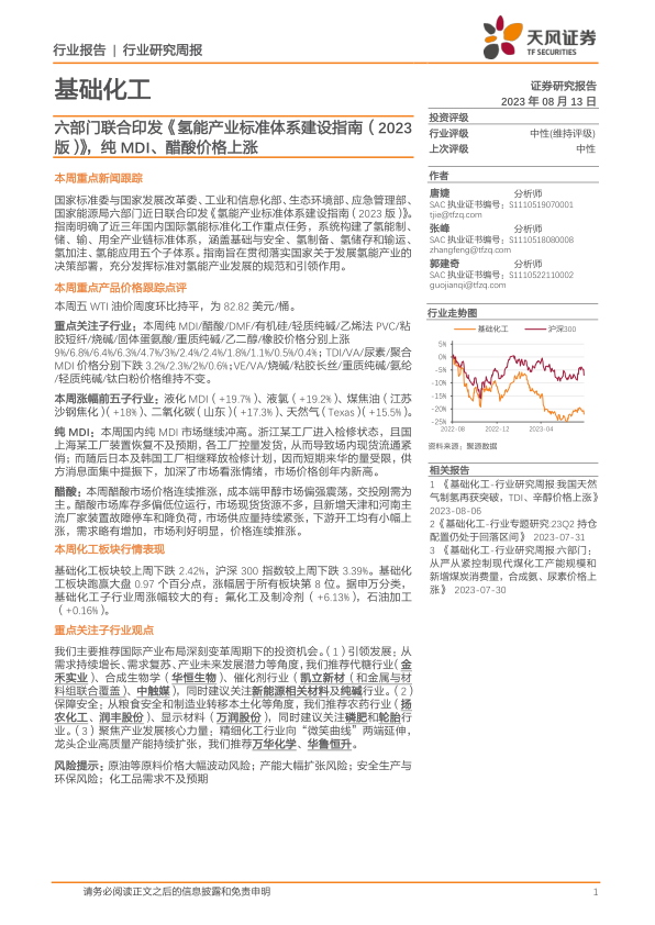基础化工行业研究周报:六部门联合印发《氢能产业标准体系建设指南(2023版)》,纯MDI、醋酸价格上涨