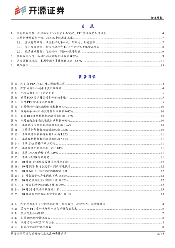 本报告的核心观点是:基础化工行业中,PTT纤维及其关键原料PDO有望实现全面突破,市场需求将加速增长。国内企业积极布局PDO和PTT产业链,有望打破国外垄断,实现国产替代,带来显著的投资机遇。同时,报告也分析了本周新材料行业整体市场表现,以及部分重点公司的动态。