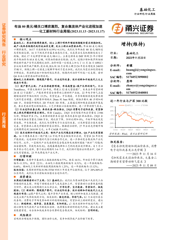 基础化工:原油价格博弈激烈, IEA 上调今明两年增速预期缓和需求预期担忧。减产+低库存短期内或形成油价支撑,关注上游石油资源品种。 布油 80 美元/桶关口博弈激烈, 16/17 日涨跌幅为-4.59%/+4.13%。 我们认为布油在 80 美元/桶附近或有较强支撑, 16 日下跌或并非基本面恶化引发,而是算法交易机制触发放大了跌幅,因此 17 日反弹重回 80 美元/桶以上。主要支撑来自 IMF 预测 23 年沙特财政平衡油价为 85.8 美元/桶,对原油价格诉求较强; 此外,近期沙特和俄罗斯相继释放额外减产信号试图稳定油价。 油价回落一定程度上加大了 11 月 26 日 OPEC+会议延长额外减产概率。需求端, IEA 较 10 月分别上调 23/24 年需求增速至 240/93万桶/日, 预期上调一定程度上缓解市场对于需求担忧。 我们认为需求担忧情绪逐步释放后,原油供应缺口和相对低位库存,短期内对油价可形成一定支撑,看好Q4 石油上游资源品种业绩表现。