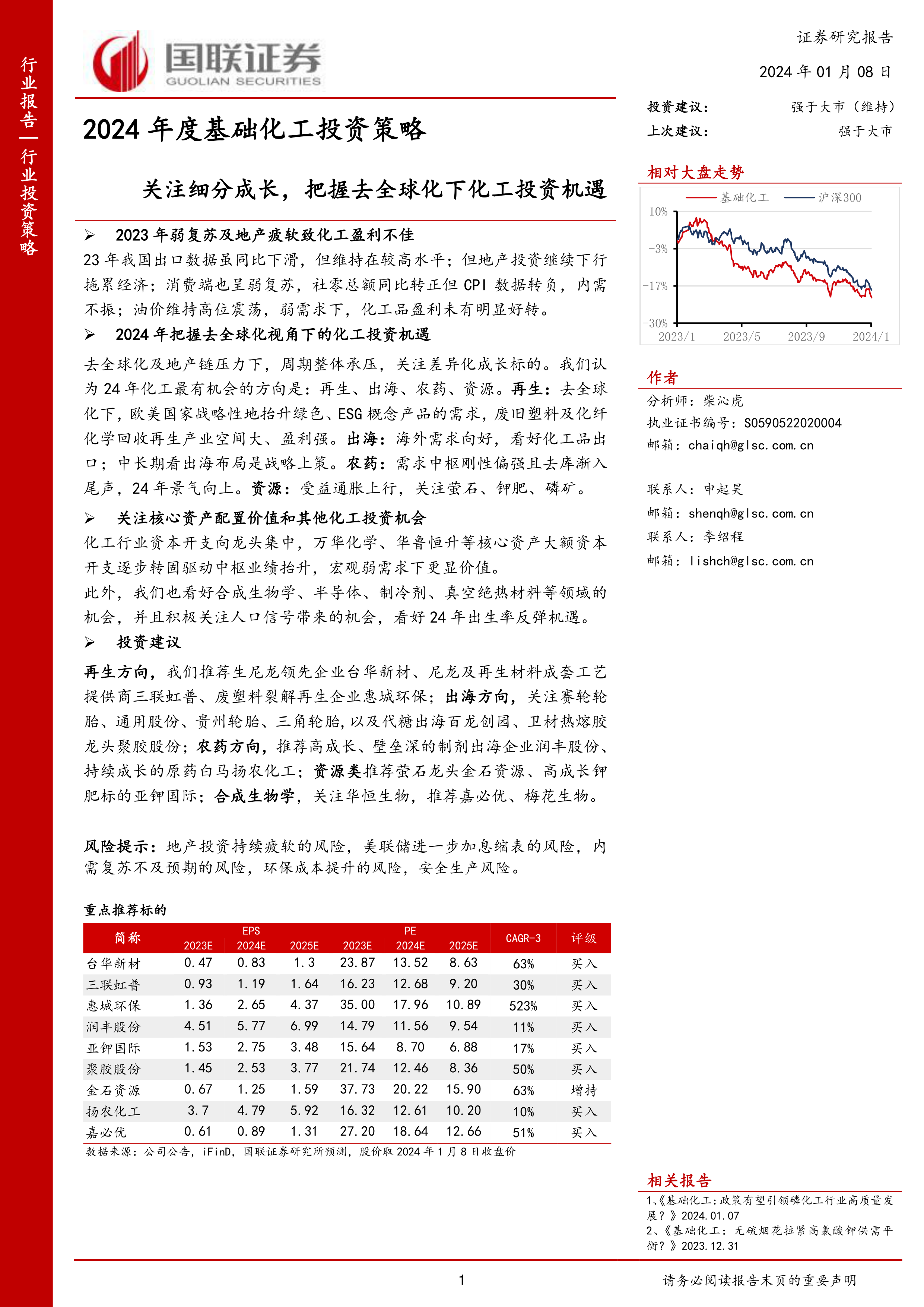 本报告基于对2023年化工行业低迷现状的分析,并结合宏观经济形势、国际贸易环境以及产业发展趋势,对2024年化工行业的投资机遇进行了深入探讨。报告建议关注再生、出海、农药和资源四大方向,同时关注核心资产配置价值以及合成生物学、半导体材料、制冷剂、真空绝热材料等细分领域的投资机会。 报告还列出了具体的重点推荐标的,并提示了地产投资持续疲软、美联储货币政策、内需复苏不及预期、环保成本提升以及安全生产等潜在风险。 投资者应结合自身情况,谨慎决策。