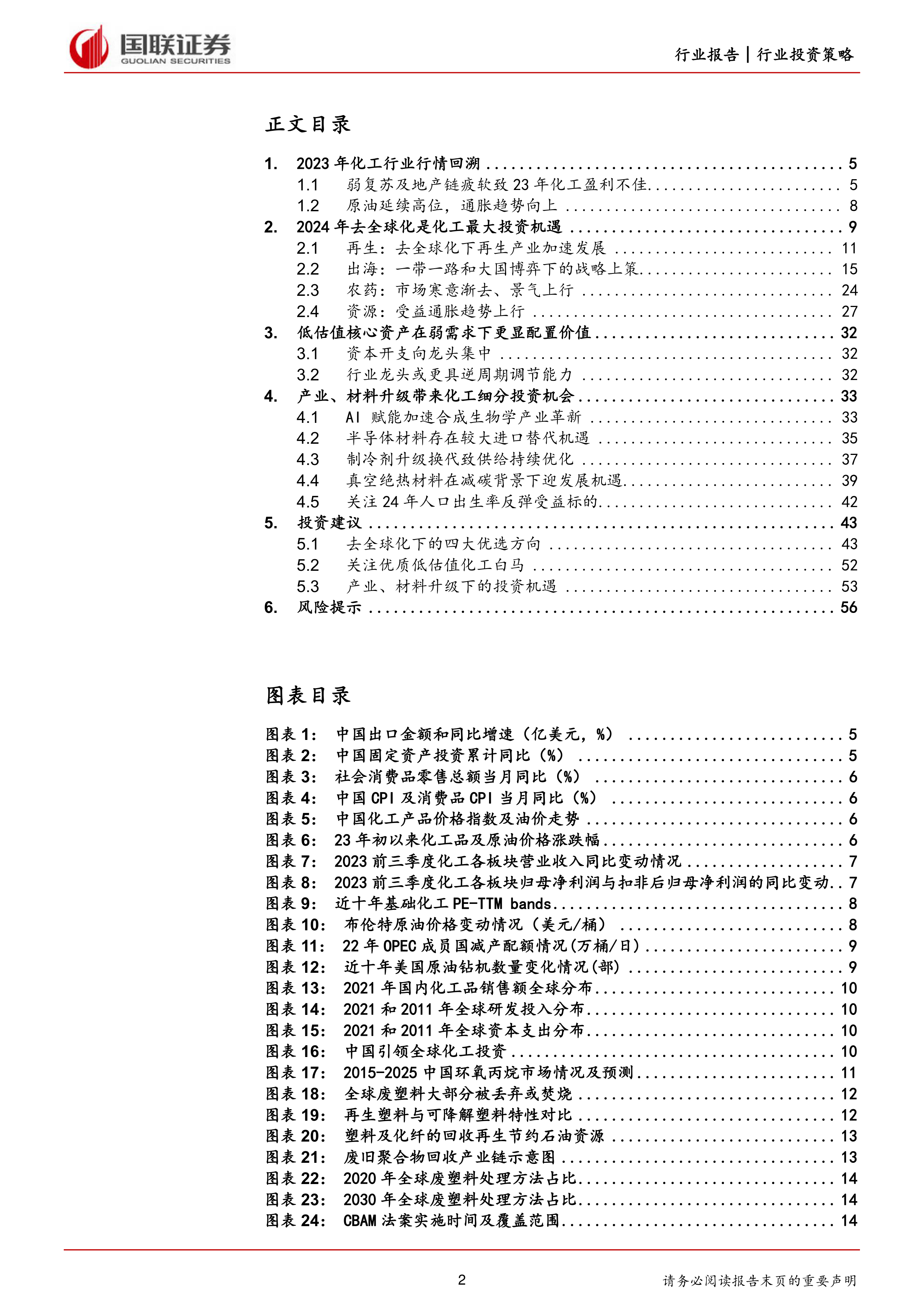 本报告的核心观点是:2023年化工行业盈利不佳,主要受国内经济弱复苏、房地产市场疲软以及全球去全球化趋势影响。但2024年,去全球化背景下,化工行业投资机遇凸显,建议关注再生、出海、农药和资源四大方向,同时关注核心资产配置价值及其他细分领域的投资机会。
