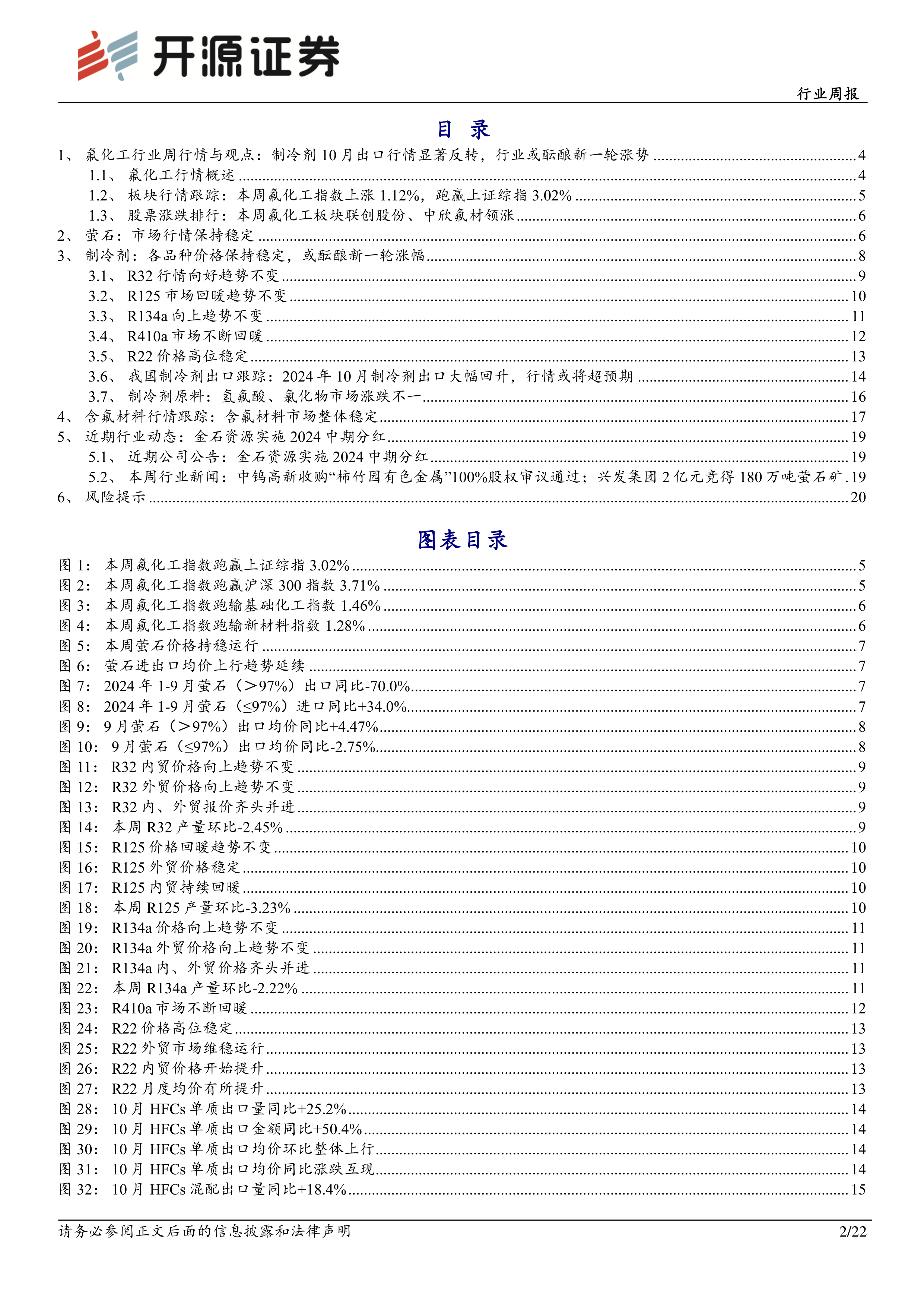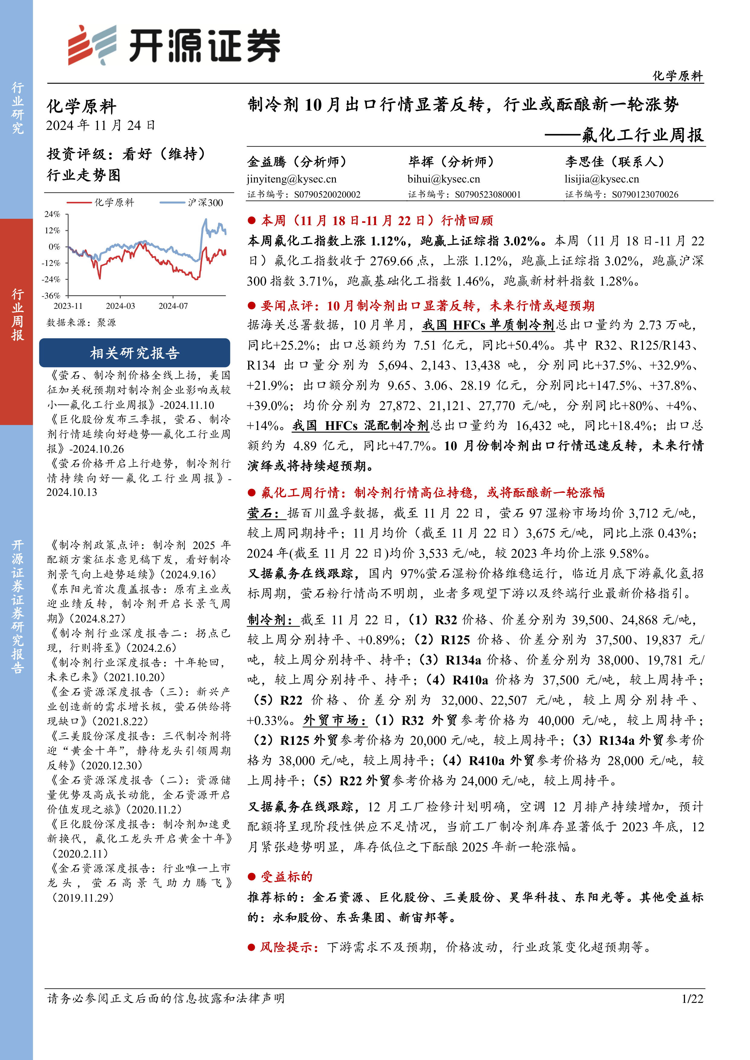 本报告详细分析了11月18日至22日氟化工行业周行情,重点关注了制冷剂和萤石市场。10月份制冷剂出口的显著反弹是本报告的突出亮点,预示着行业可能迎来新一轮涨势。萤石市场则相对稳定,但下游需求和招标周期带来市场观望。报告还分析了各主要制冷剂品种的价格走势及其驱动因素,并对相关原料市场进行了简要概述。最后,报告总结了近期行业动态,并提示了潜在的市场风险。整体而言,报告对氟化工行业未来发展持乐观态度,并推荐了部分投资标的。 报告数据主要来源于Wind、百川盈孚、氟务在线、海关总署等权威机构,具有较高的参考价值。 然而,投资者仍需谨慎,并结合自身情况进行独立判断。