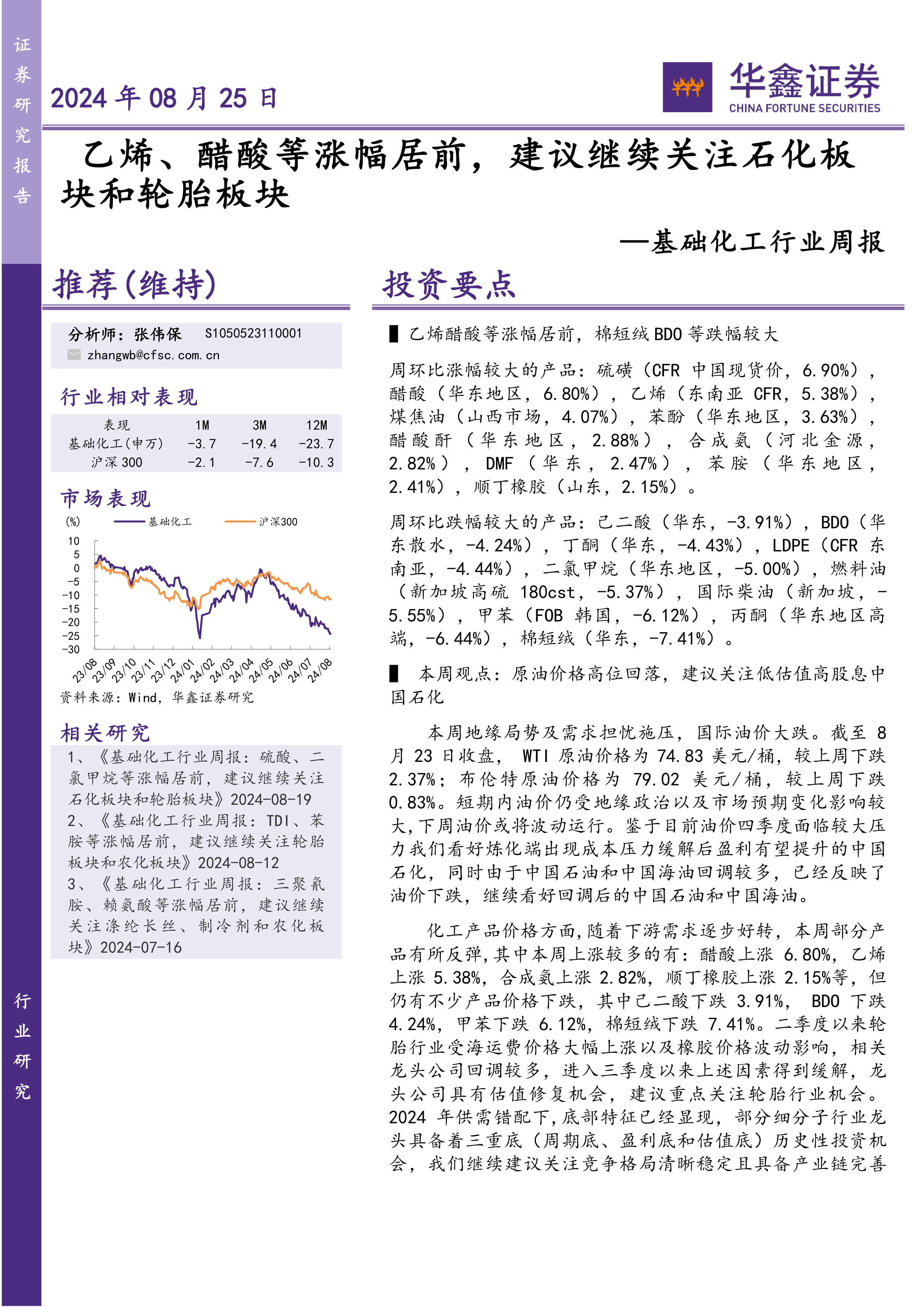 基础化工行业周报:乙烯、醋酸等涨幅居前,建议继续关注石化板块和轮胎板块