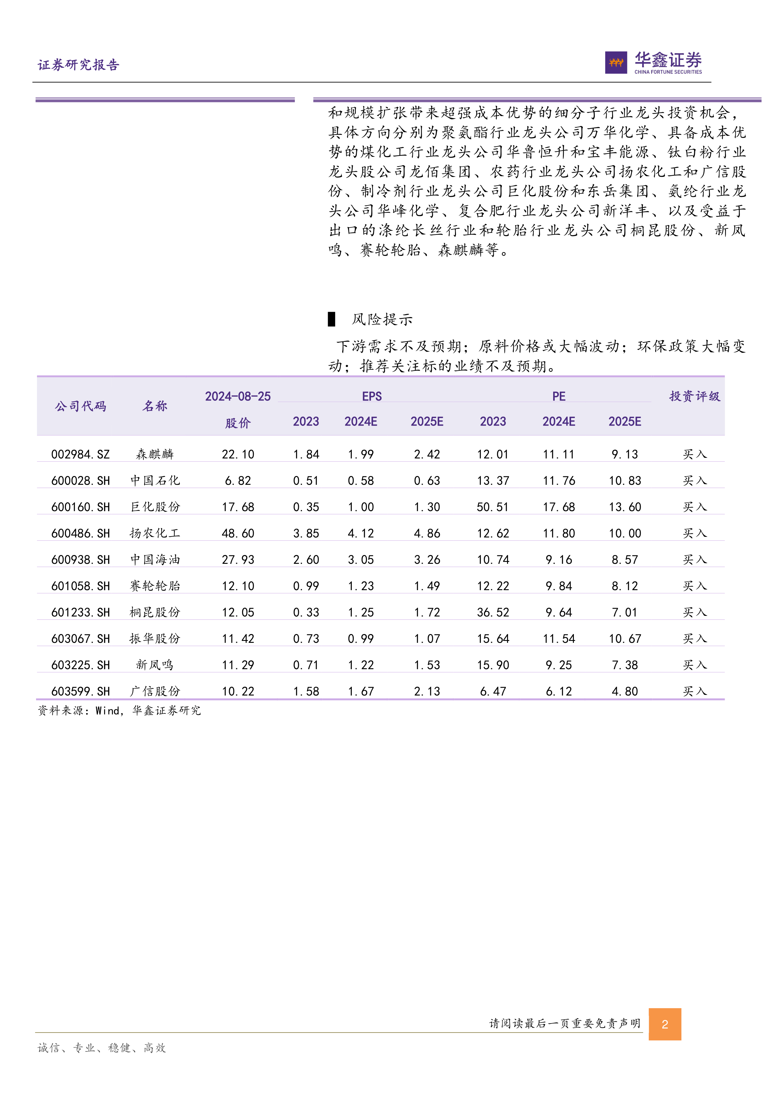 报告最后列出了投资风险提示,包括下游需求不及预期、原料价格大幅波动、环保政策大幅变动以及推荐关注标的业绩不及预期等。