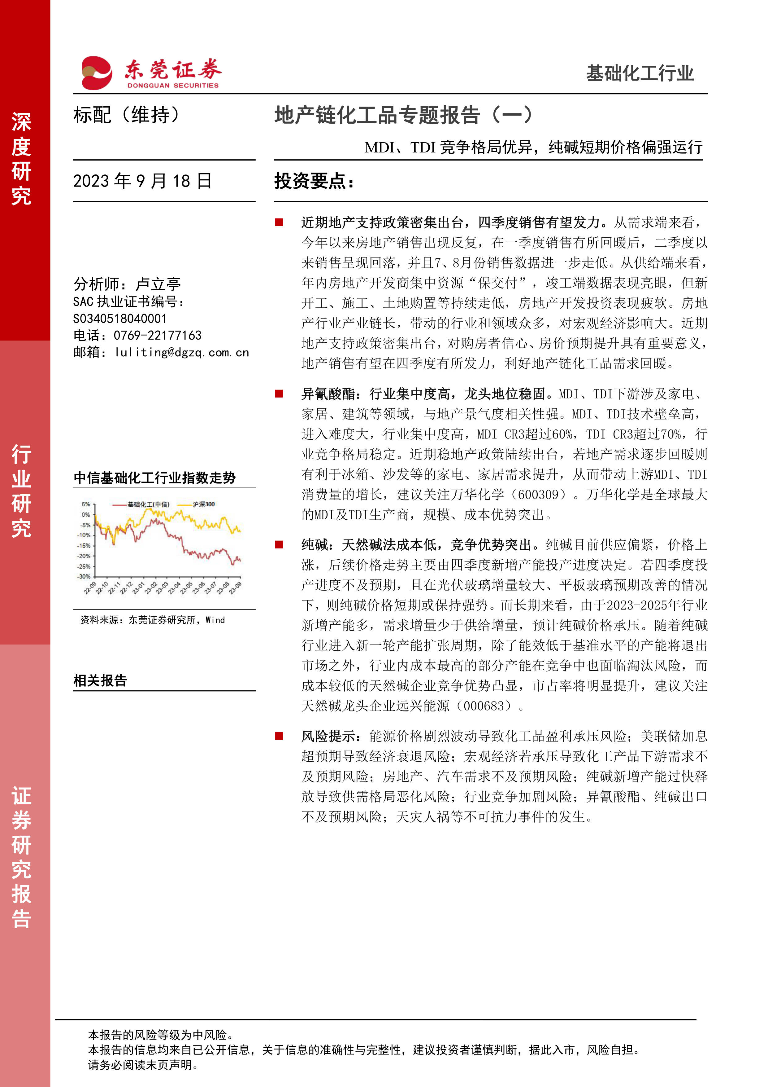 本报告的核心观点是:房地产市场政策的调整对地产链化工品市场产生显著影响。短期内,政策利好有望推动四季度地产销售回暖,进而带动MDI、TDI及纯碱需求提升;长期来看,纯碱行业产能扩张将加剧市场竞争,低成本的天然碱企业将占据优势地位。