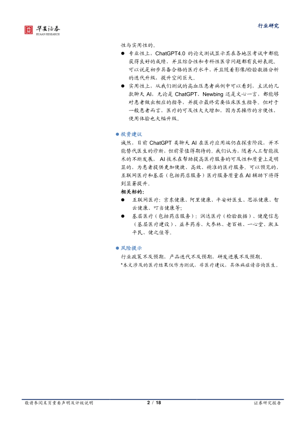 报告最后给出了投资建议和风险提示。投资建议是看好AI技术在医疗领域的应用前景,认为其将显著提升医疗服务的可及性和质量,并推荐了相关的互联网医疗和基层医疗公司标的。风险提示包括行业政策不及预期、产品迭代不及预期、研发进展不及预期等。