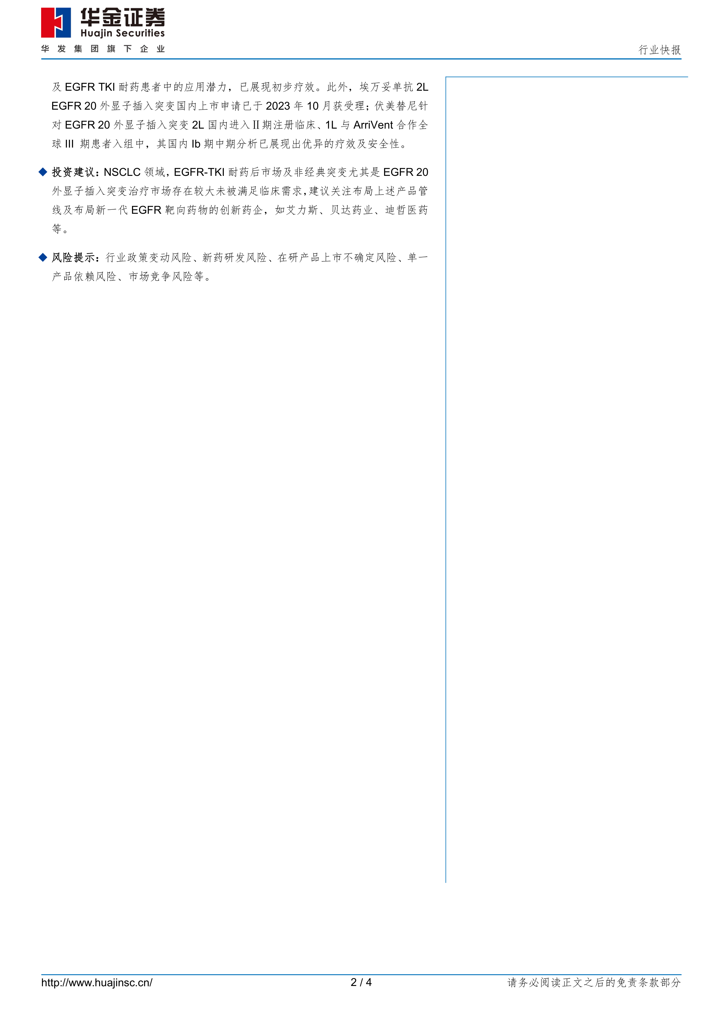报告最后给出了投资建议,建议关注布局上述产品管线及新一代EGFR靶向药物的创新药企,如艾力斯、贝达药业、迪哲医药等。 同时,报告也列出了相应的风险提示,包括行业政策变动风险、新药研发风险、市场竞争风险等,提醒投资者谨慎投资。