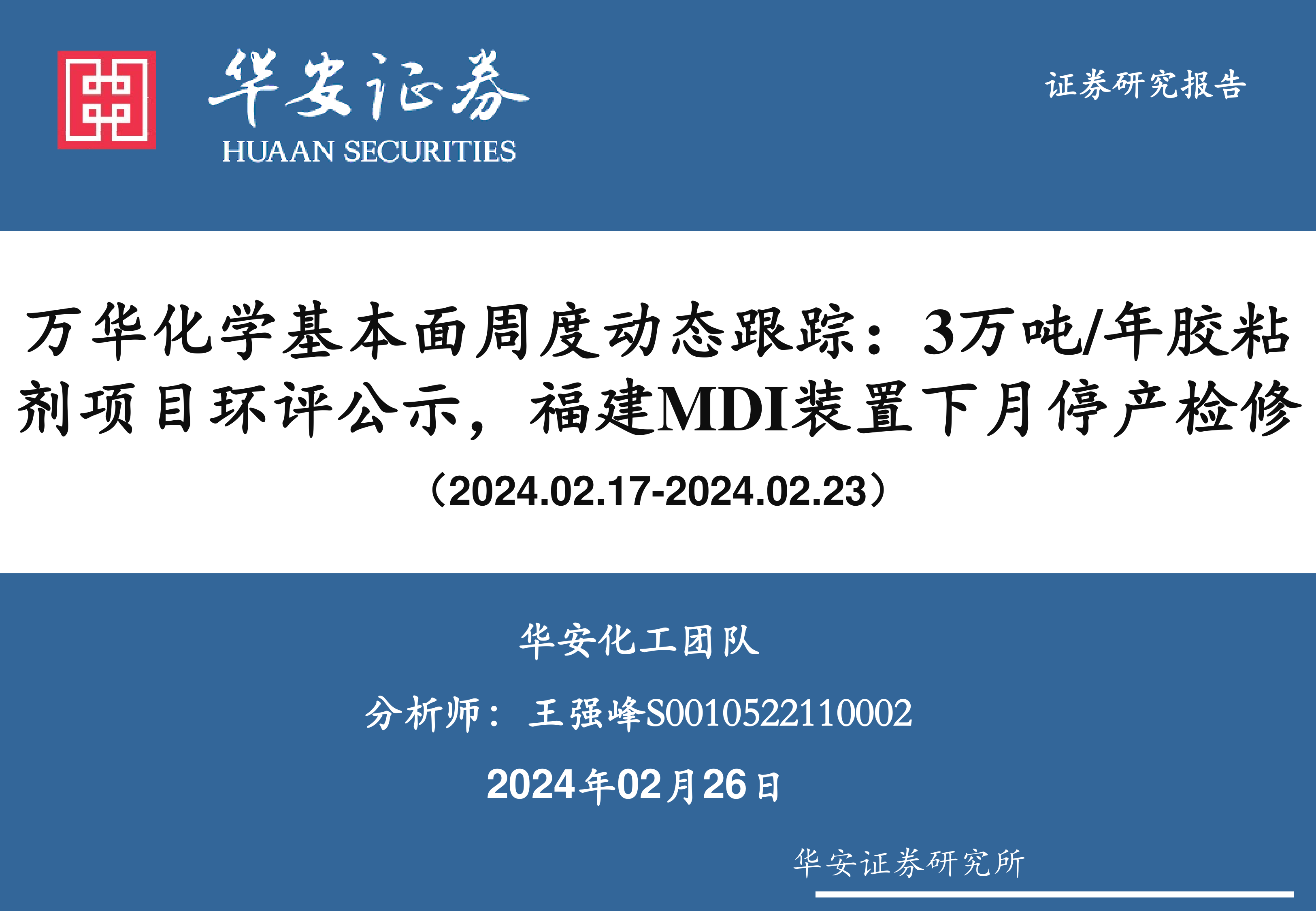 万华化学基本面周度动态跟踪:3万吨/年胶粘剂项目环评公示,福建MDI装置下月停产检修