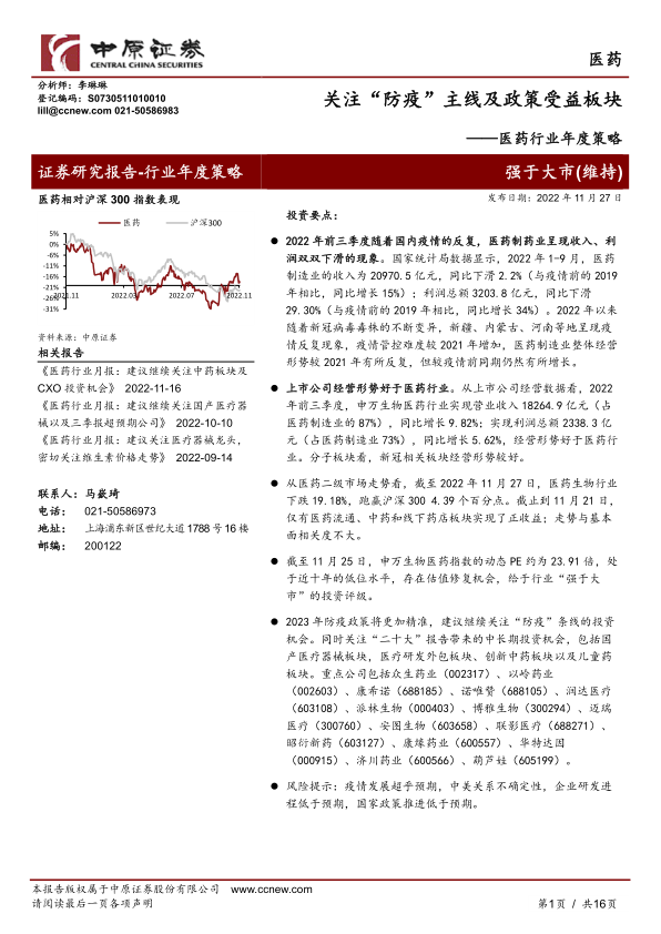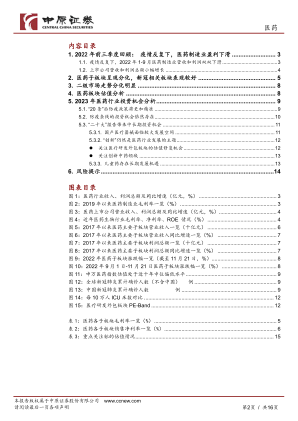 本报告的核心观点是:2022年前三季度,受国内疫情反复影响,医药制造业整体盈利下滑,但上市公司表现相对较好,部分新冠相关板块甚至实现增长。二级市场走势与基本面关联度不高,目前估值处于低位,存在修复机会。展望2023年,随着防疫政策更加精准,“防疫”主线及相关板块仍有投资机会;同时,“二十大”报告带来的中长期投资机会值得关注,包括国产医疗器械、医疗研发外包、创新中药和儿童药等板块。