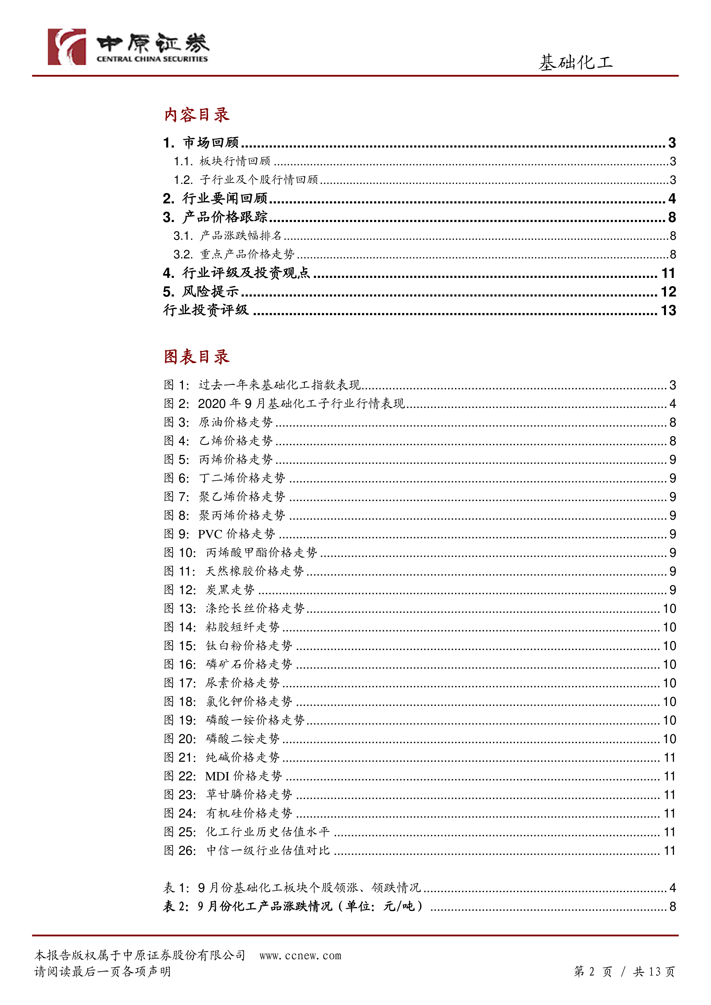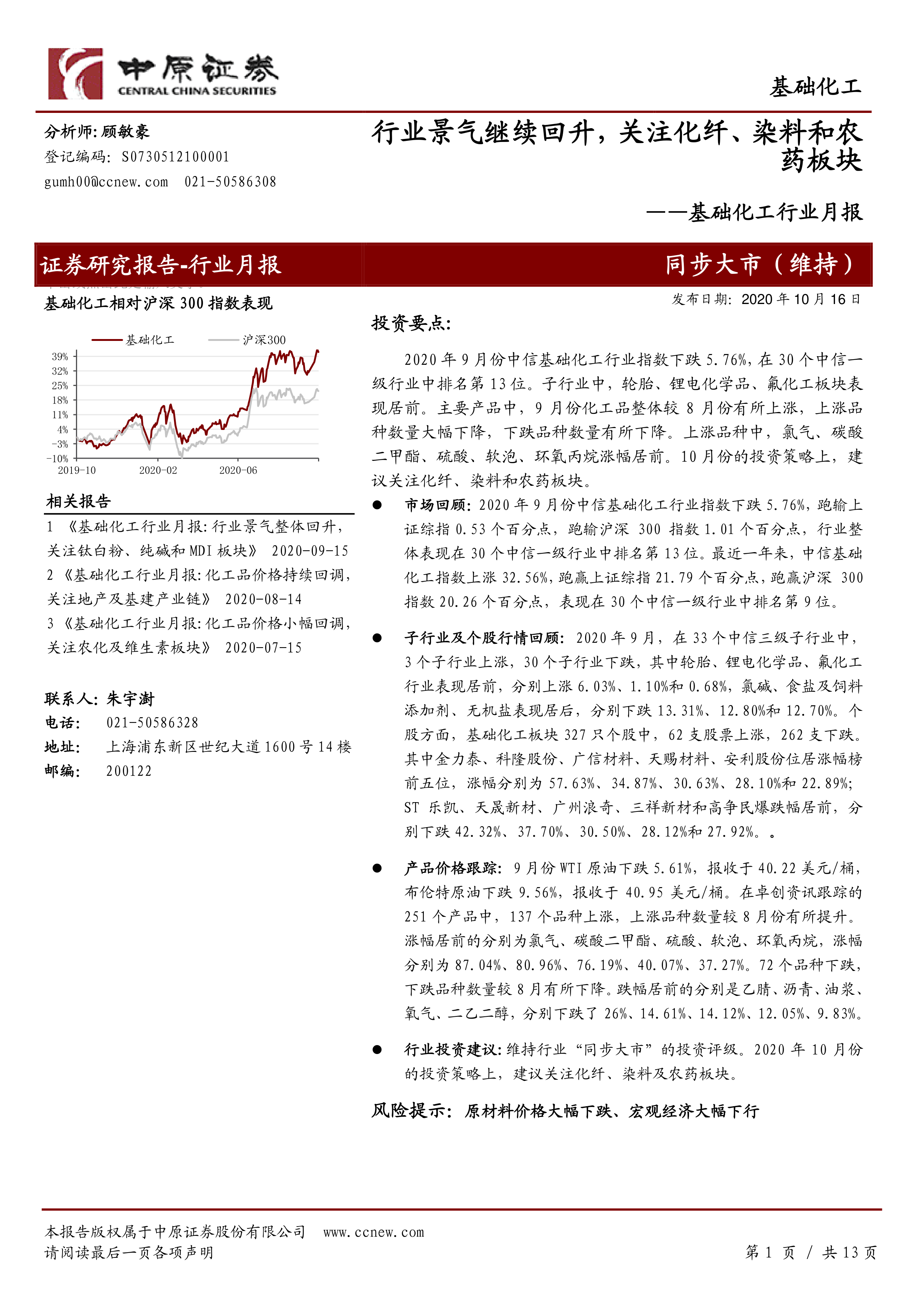 本报告的核心观点是:2020年9月,中信基础化工行业指数下跌,跑输大盘,但长期来看,该行业表现强劲。短期内,建议关注化纤、染料和农药板块;长期来看,应关注具有产业链一体化、低成本优势和高产品质量的龙头企业。 报告同时分析了行业内各子行业及个股表现,以及主要化工产品价格波动,并对未来行业发展趋势进行了展望。