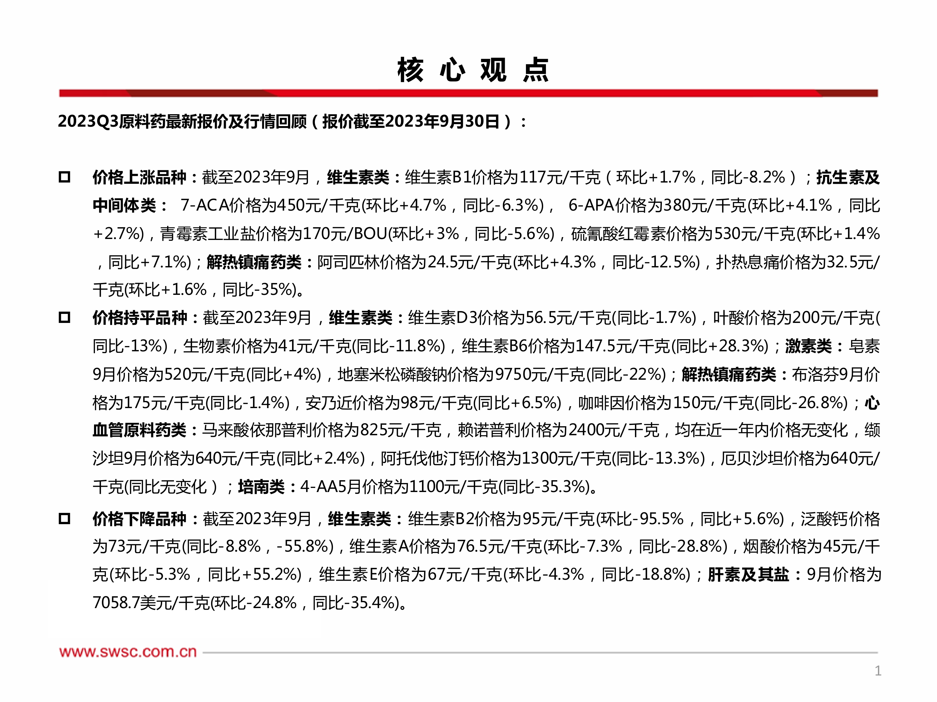 原料药板块2023Q3跟踪报告:原料药价格总体平稳,肝素报价环比下滑