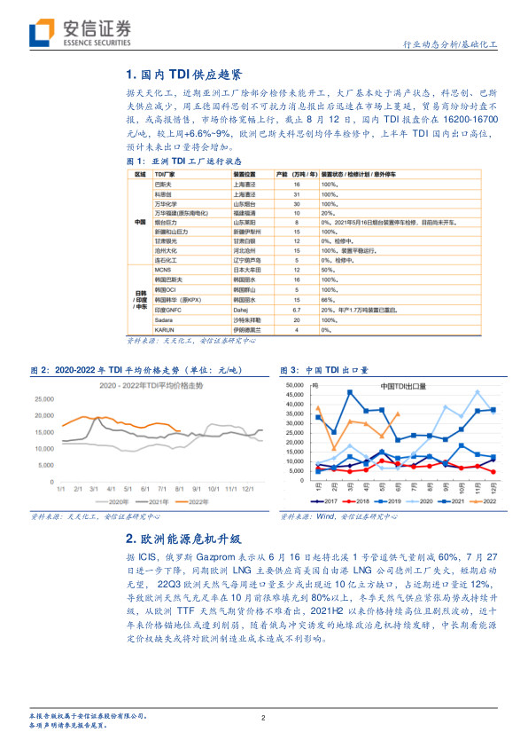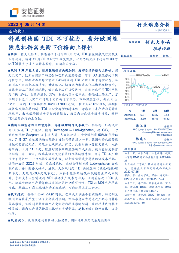 基础化工行业动态分析:科思创德国TDI不可抗力,看好欧洲能源危机供需失衡下价格向上弹性