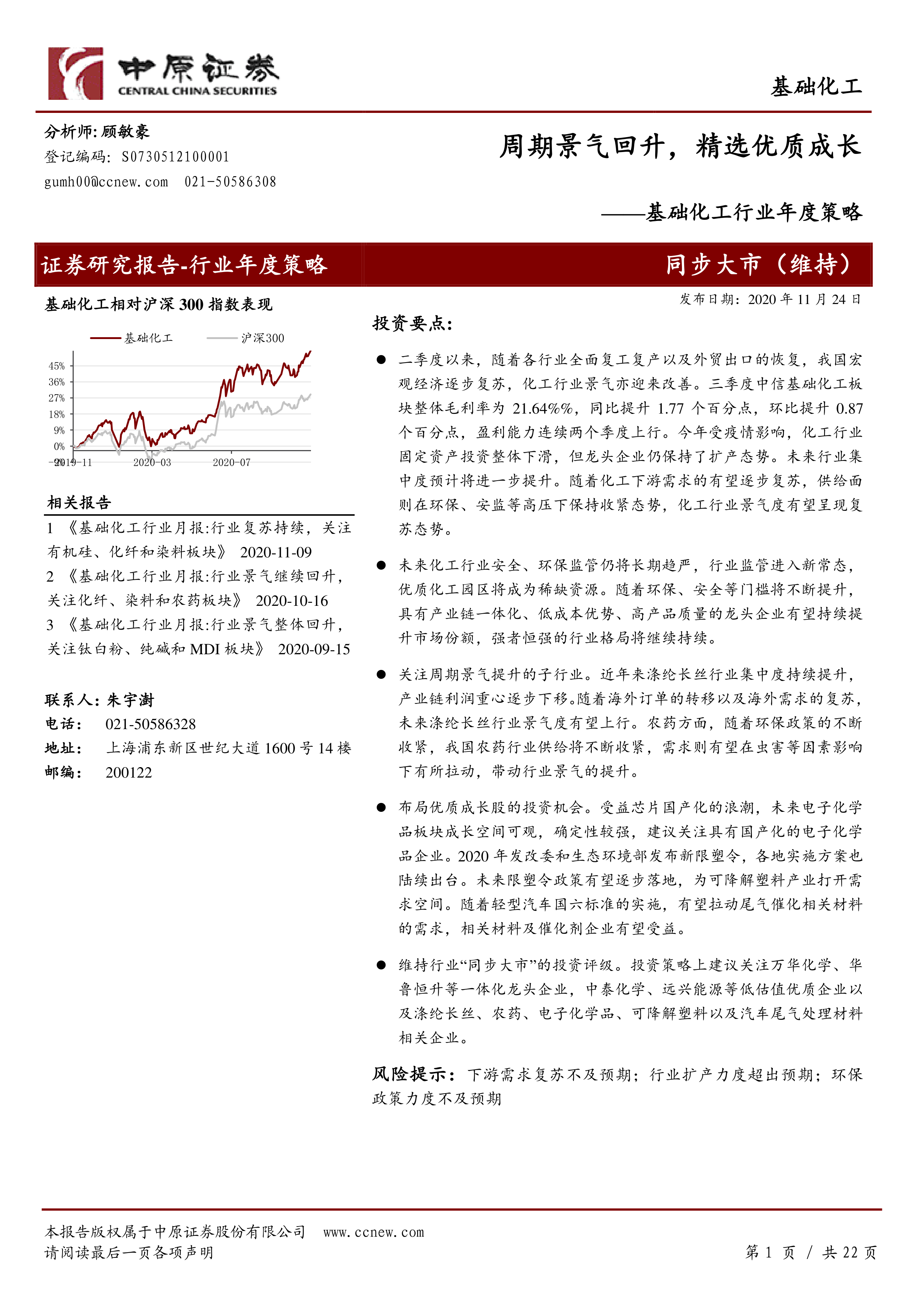 维持行业“同步大市”的投资评级。投资策略上建议关注万华化学、华鲁恒升等一体化龙头企业,中泰化学、远兴能源等低估值优质企业以及涤纶长丝、农药、电子化学品、可降解塑料以及汽车尾气处理材料相关企业。