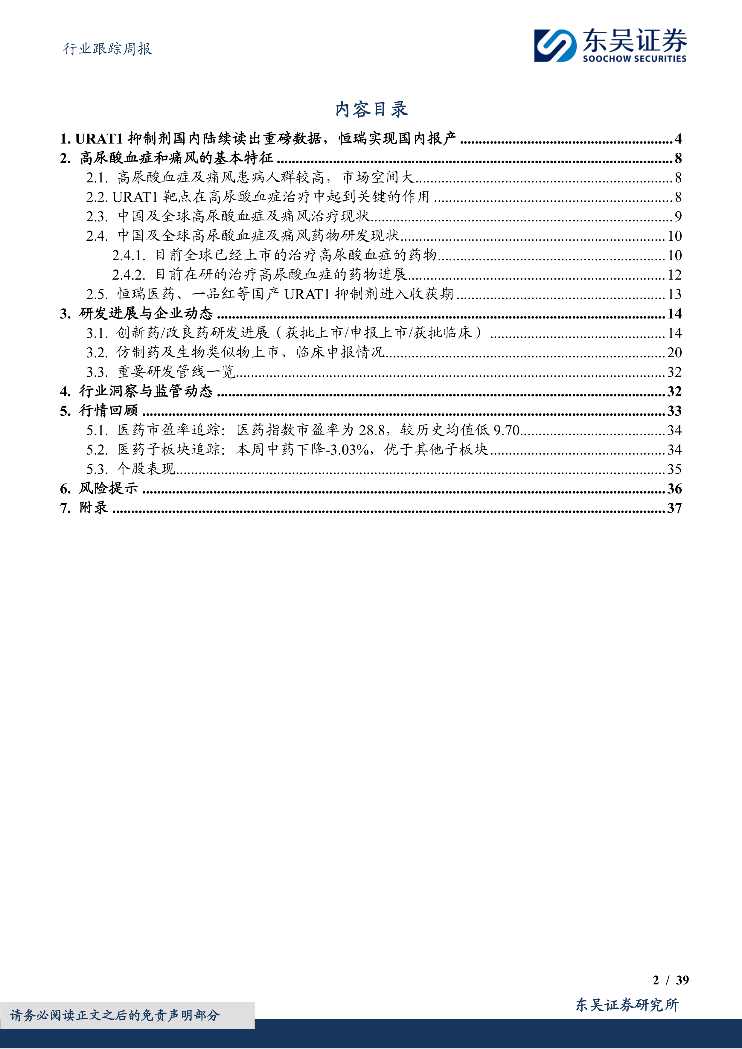 本报告的核心观点是:URAT1抑制剂在治疗高尿酸血症和痛风领域展现出巨大潜力,市场空间广阔。恒瑞医药、一品红和益方生物等公司研发的URAT1抑制剂已取得显著临床进展,有望成为该领域的大单品,值得关注。报告同时分析了医药行业整体市场表现、高尿酸血症和痛风的疾病特征及治疗现状,以及相关创新药和仿制药的研发进展。