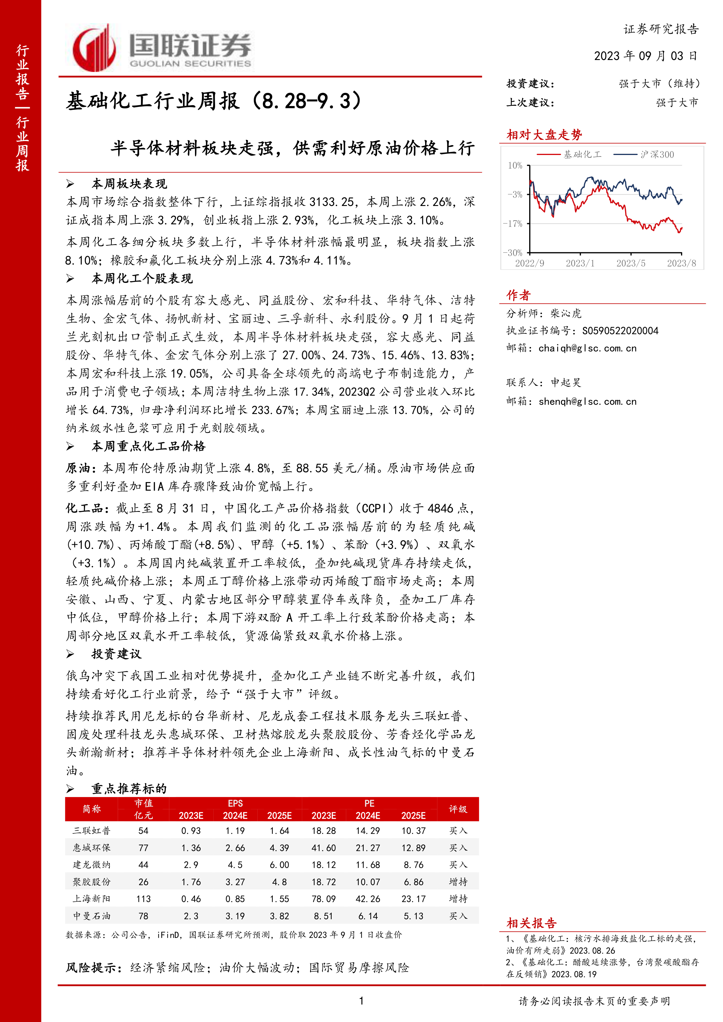 持续推荐民用尼龙标的台华新材、尼龙成套工程技术服务龙头三联虹普、固废处理科技龙头惠城环保、卫材热熔胶龙头聚胶股份、芳香烃化学品龙头新瀚新材;推荐半导体材料领先企业上海新阳、成长性油气标的中曼石油。