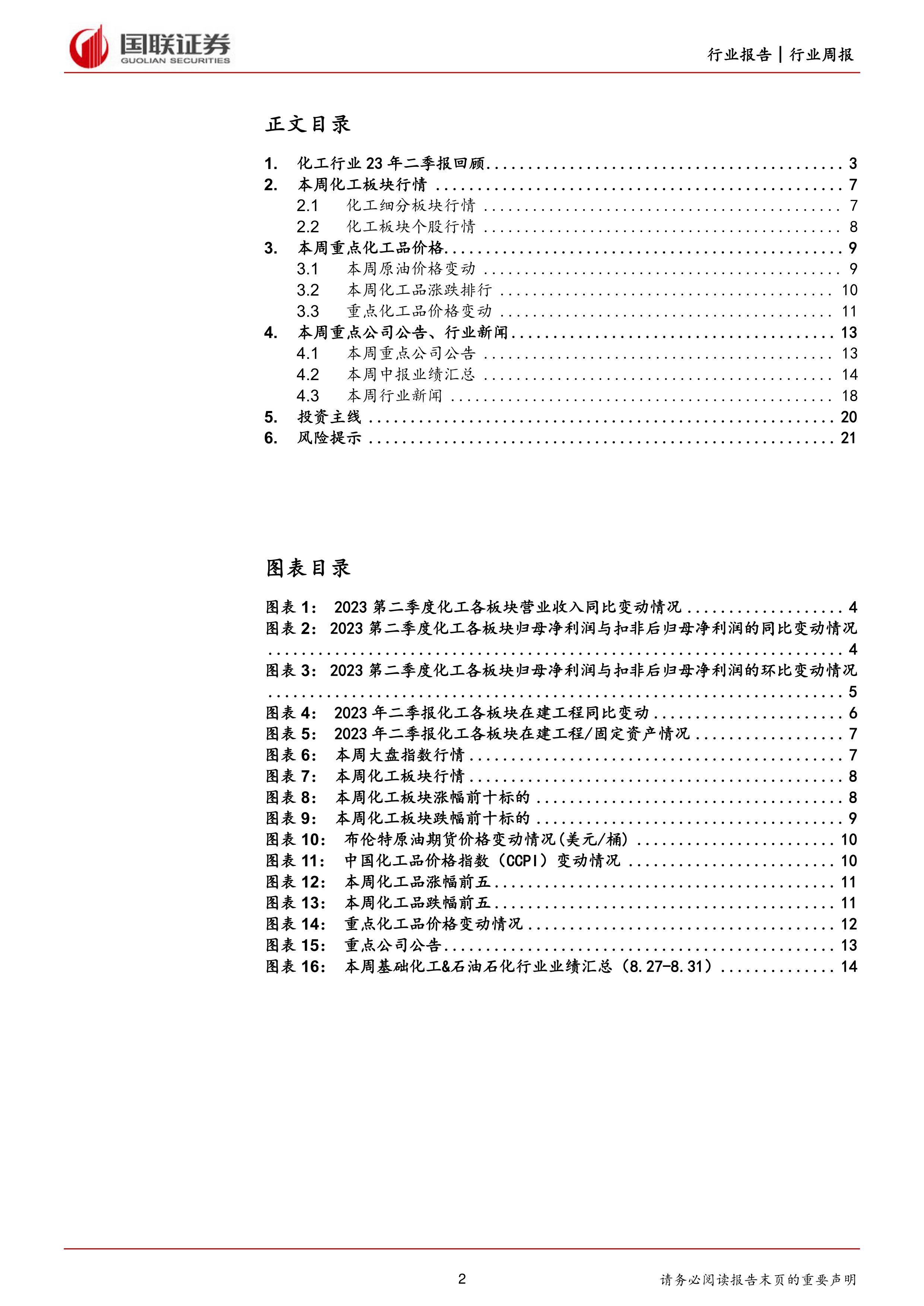 本报告对2023年二季度基础化工行业业绩进行了全面回顾,并对本周市场行情进行了深入分析。 尽管二季度行业整体业绩下滑,但部分细分板块表现强劲,且本周受地缘政治和市场供需变化影响,部分板块和个股出现显著波动。 我们维持对基础化工行业“强于大市”的评级,并重点推荐了在多个细分领域具有竞争优势的企业,同时提醒投资者关注潜在的经济、油价和地缘政治风险。 报告中提供的投资建议仅供参考,投资者应根据自身情况进行独立判断。