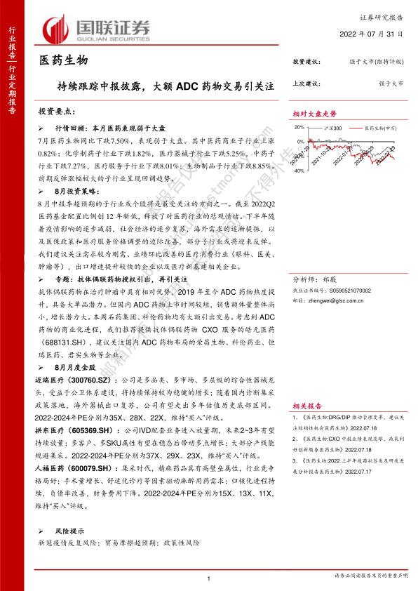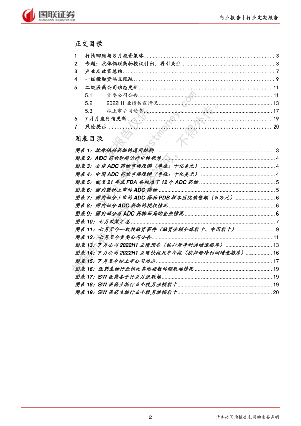 本报告的核心观点是:7月份医药生物行业表现弱于大盘,主要原因是前期受益于新冠疫情的相关行业面临回调压力,市场趋向回避新冠收入占比大的企业。展望8月,疫情复苏和业绩增长仍是关键,建议关注需求刚性、业绩环比改善的消费医疗和医疗服务行业,以及出口增速较快的医疗企业。长期来看,建议关注高行业景气度的医疗新基建公司和医保免疫的医疗服务和医疗消费相关公司。此外,抗体偶联药物(ADC)市场潜力巨大,国内ADC药物市场尚处于发展初期,具有较大的增长空间,值得关注相关企业。