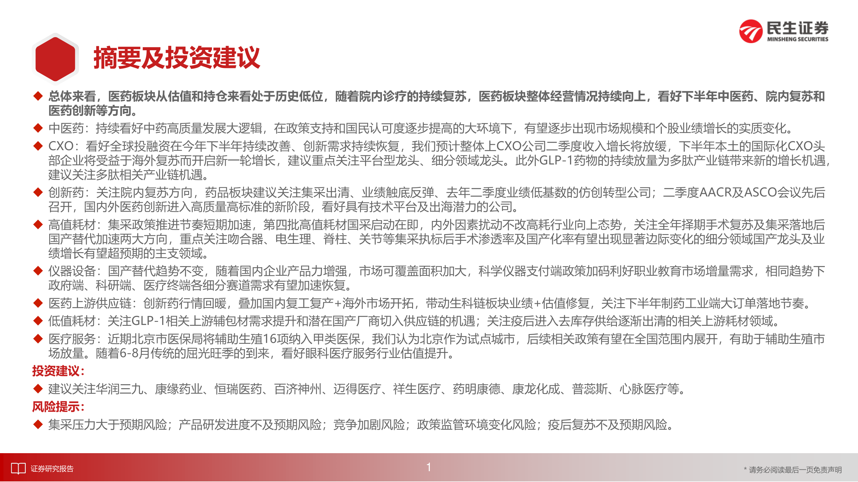 建议关注华润三九、康缘药业、恒瑞医药、百济神州、迈得医疗、祥生医疗、药明康德、康龙化成、普蕊斯、心脉医疗等。