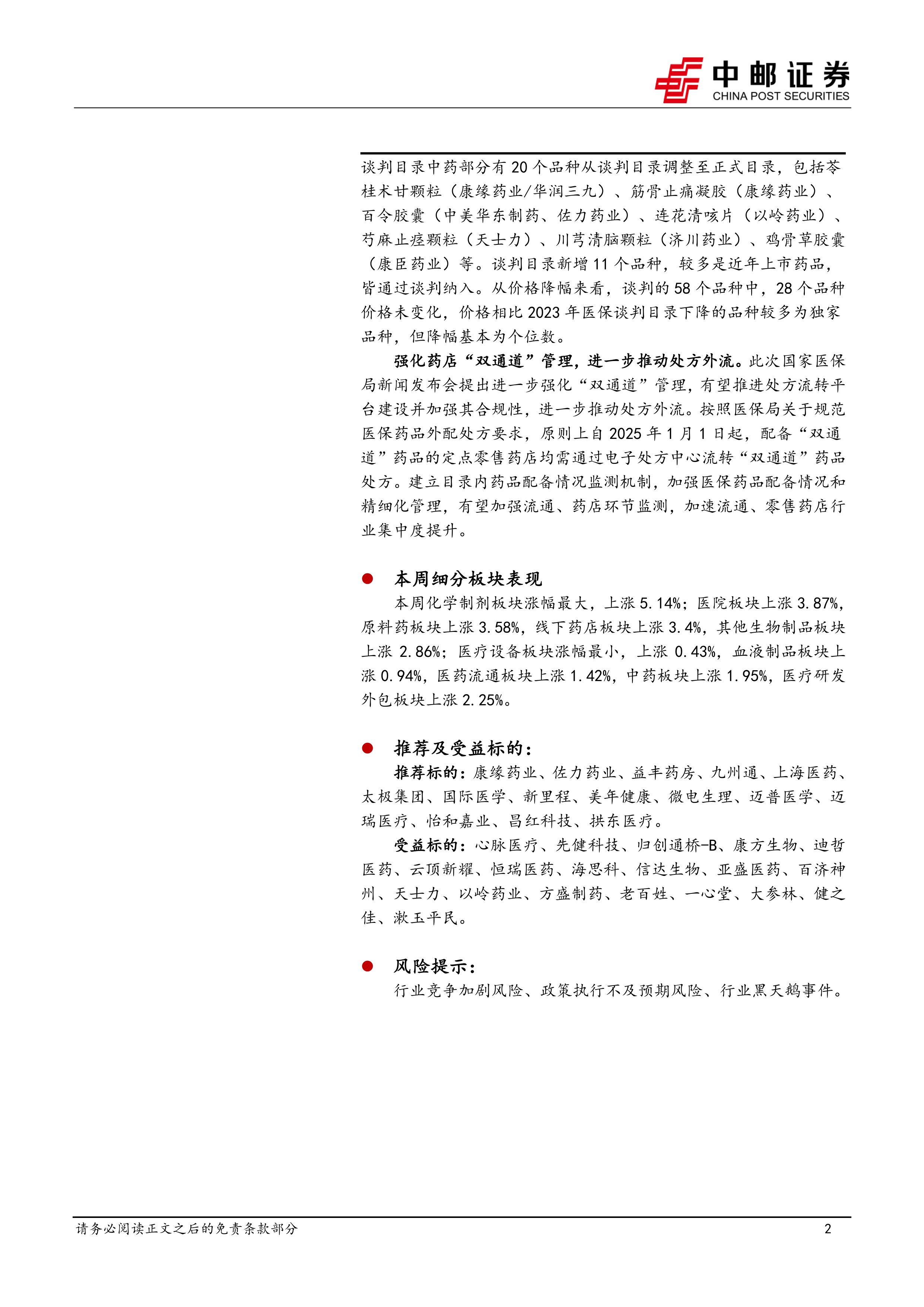 强化药店“双通道”管理,进一步推动处方外流。此次国家医保局新闻发布会提出进一步强化“双通道”管理,有望推进处方流转平台建设并加强其合规性,进一步推动处方外流。按照医保局关于规范医保药品外配处方要求,原则上自2025年1月1日起,配备“双通道”药品的定点零售药店均需通过电子处方中心流转“双通道”药品处方。建立目录内药品配备情况监测机制,加强医保药品配备情况和精细化管理,有望加强流通、药店环节监测,加速流通、零售药店行业集中度提升。