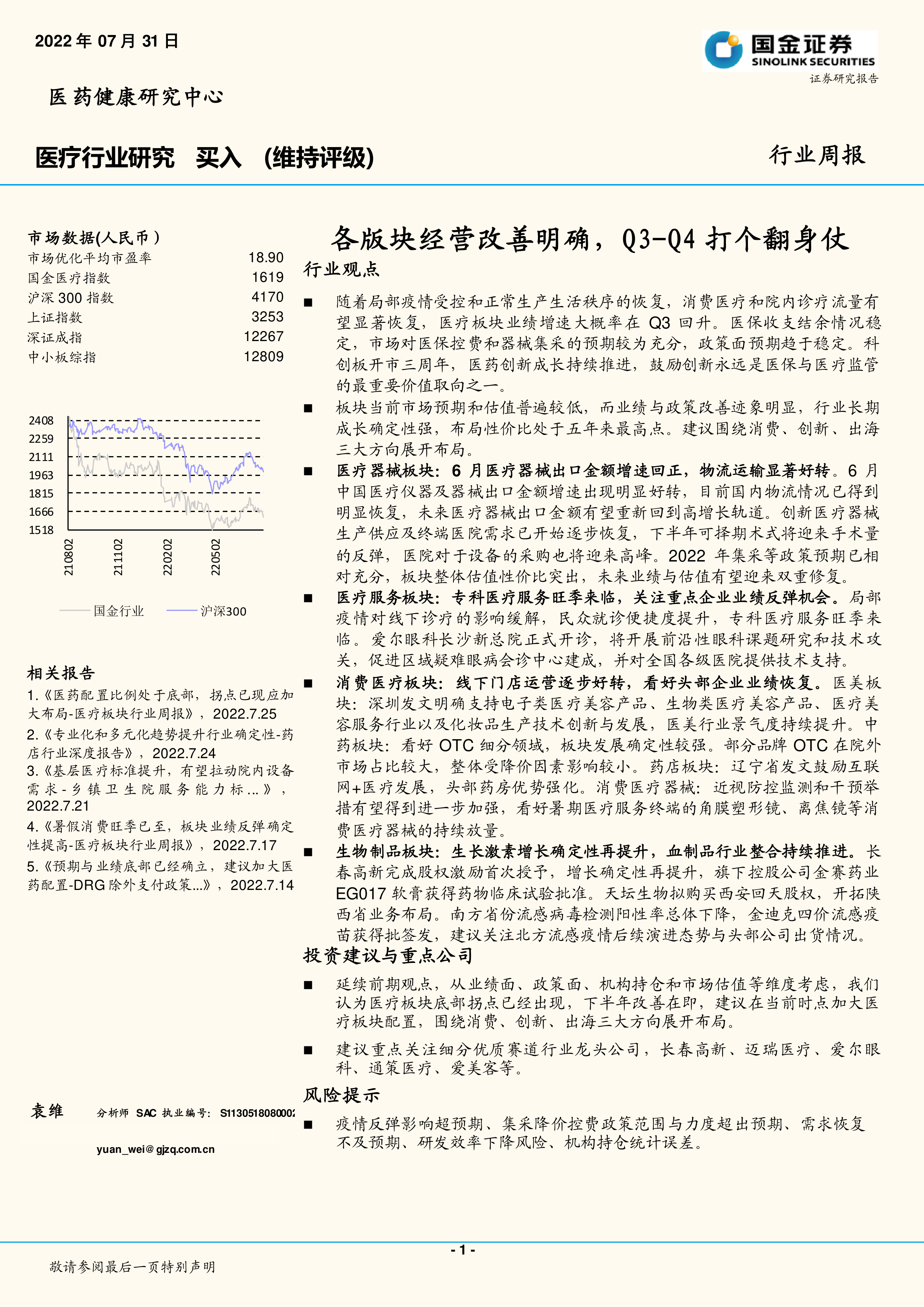 延续前期观点,从业绩面、政策面、机构持仓和市场估值等维度考虑,我们认为医疗板块底部拐点已经出现,下半年改善在即,建议在当前时点加大医疗板块配置,围绕消费、创新、出海三大方向展开布局。