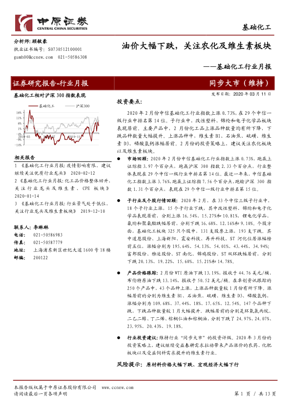 本报告的核心观点是:2020年2月,基础化工行业整体表现相对稳健,但受国际油价大幅下跌影响,行业内部分化明显。建议投资者关注受益于春耕需求和饲料需求提升的农化和维生素板块。
