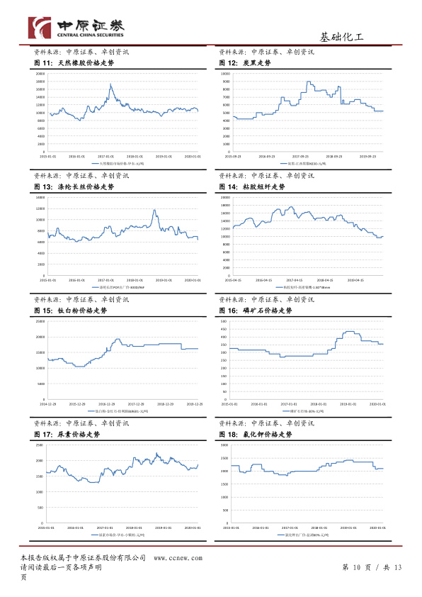 报告详细跟踪了250个化工产品的价格变化。2月份,43个产品价格上涨,147个产品价格下跌。维生素B1、石油焦、硫磺、维生素D3、磷酸氢钙涨幅居前,而环氧氯丙烷、二乙二醇、丁二烯、棕榈仁油和棕榈油跌幅居前。 图表详细展示了原油、乙烯、丙烯、丁二烯、聚乙烯、聚丙烯、PVC、丙烯酸甲酯、天然橡胶、炭黑、涤纶长丝、粘胶短纤、钛白粉、磷矿石、尿素、氯化钾、磷酸一铵、磷酸二铵、纯碱、MDI、草甘膦、有机硅等多种重要化工产品的价格走势。